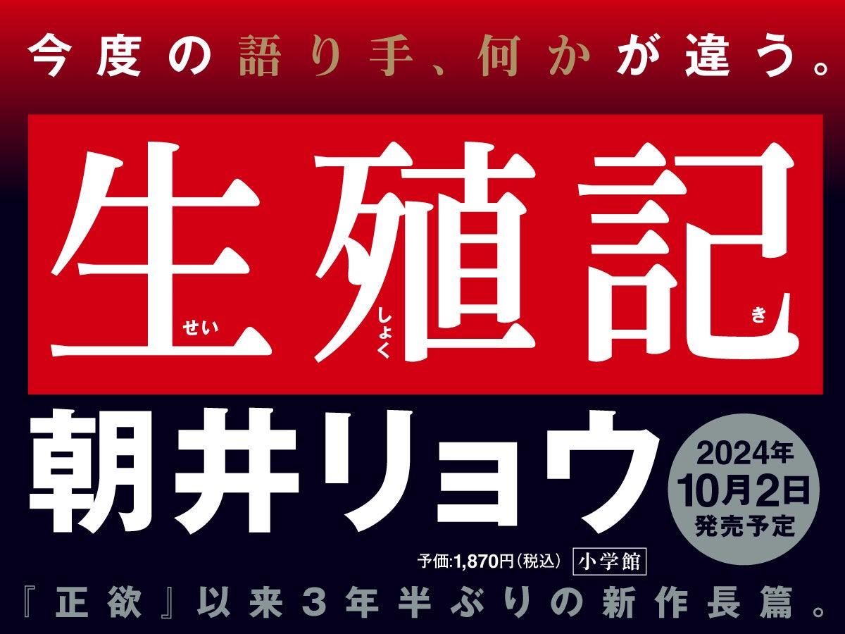 『正欲』以来3年半ぶり、作家・朝井リョウの新作長篇小説『生殖記』を2024年10月2日、小学館より刊行いたします。本日より、特設サイトを開設。全国の書店、ネット書店、電子書籍書店で予約受付を開始いたします。