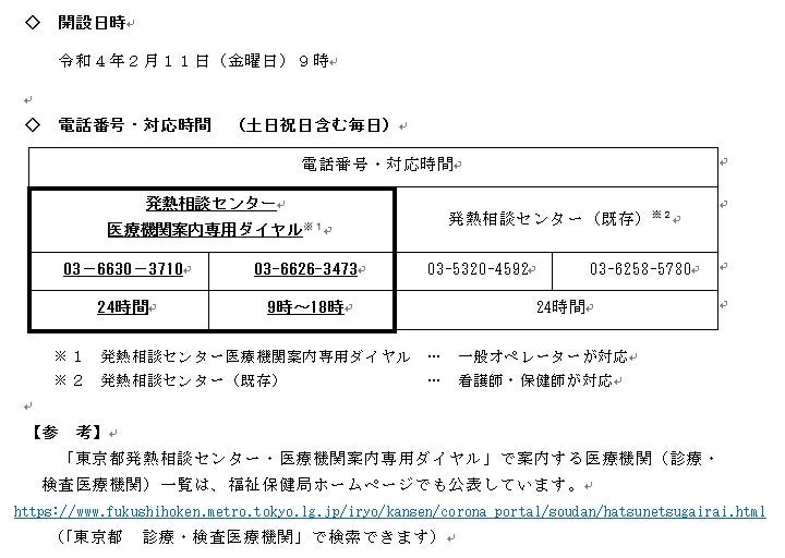 「東京都発熱相談センター 医療機関案内専用ダイヤル」を開設します-24時間対応を含む、2つの電話番号で対応-