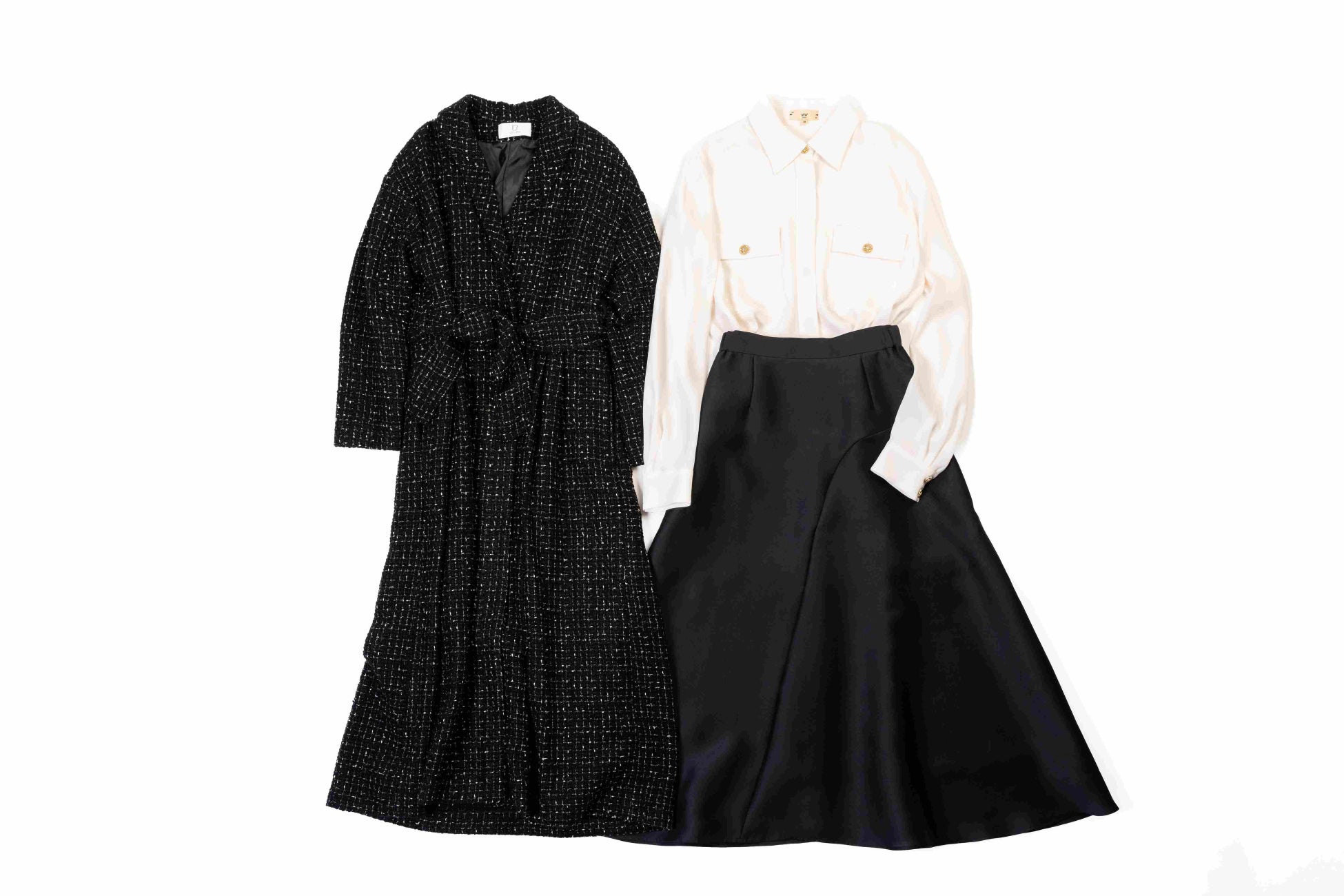 右:<エムダブリュー>バックサテンビジューボタンブラウス 47,300円、トリアセテートサテンフレアスカート 51,700円