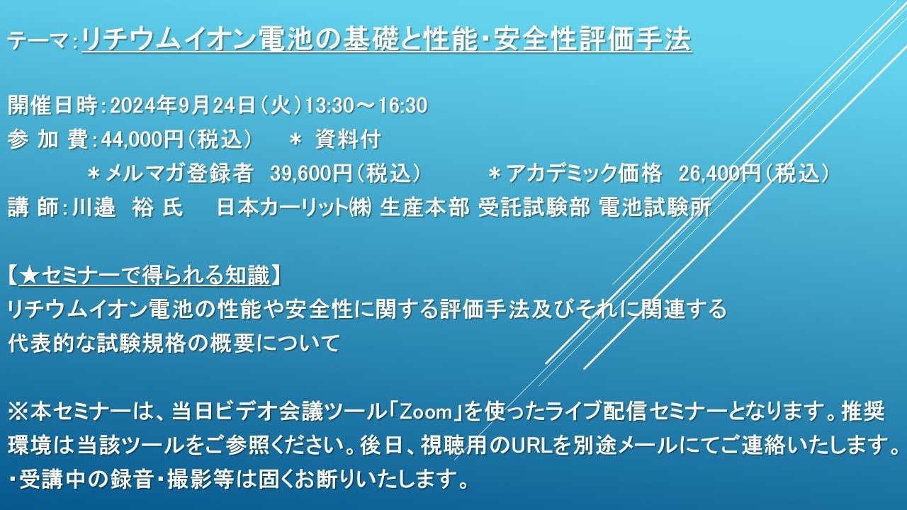 【ライブ配信セミナー】リチウムイオン電池の基礎と性能・安全性評価手法 9月24日(火)開催 主催:(株)シーエムシー・リサーチ