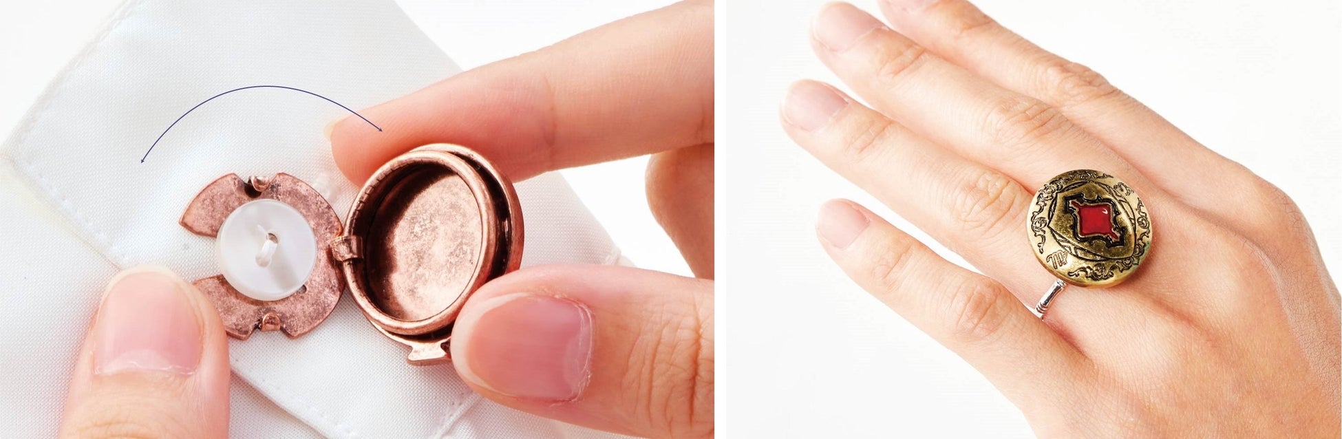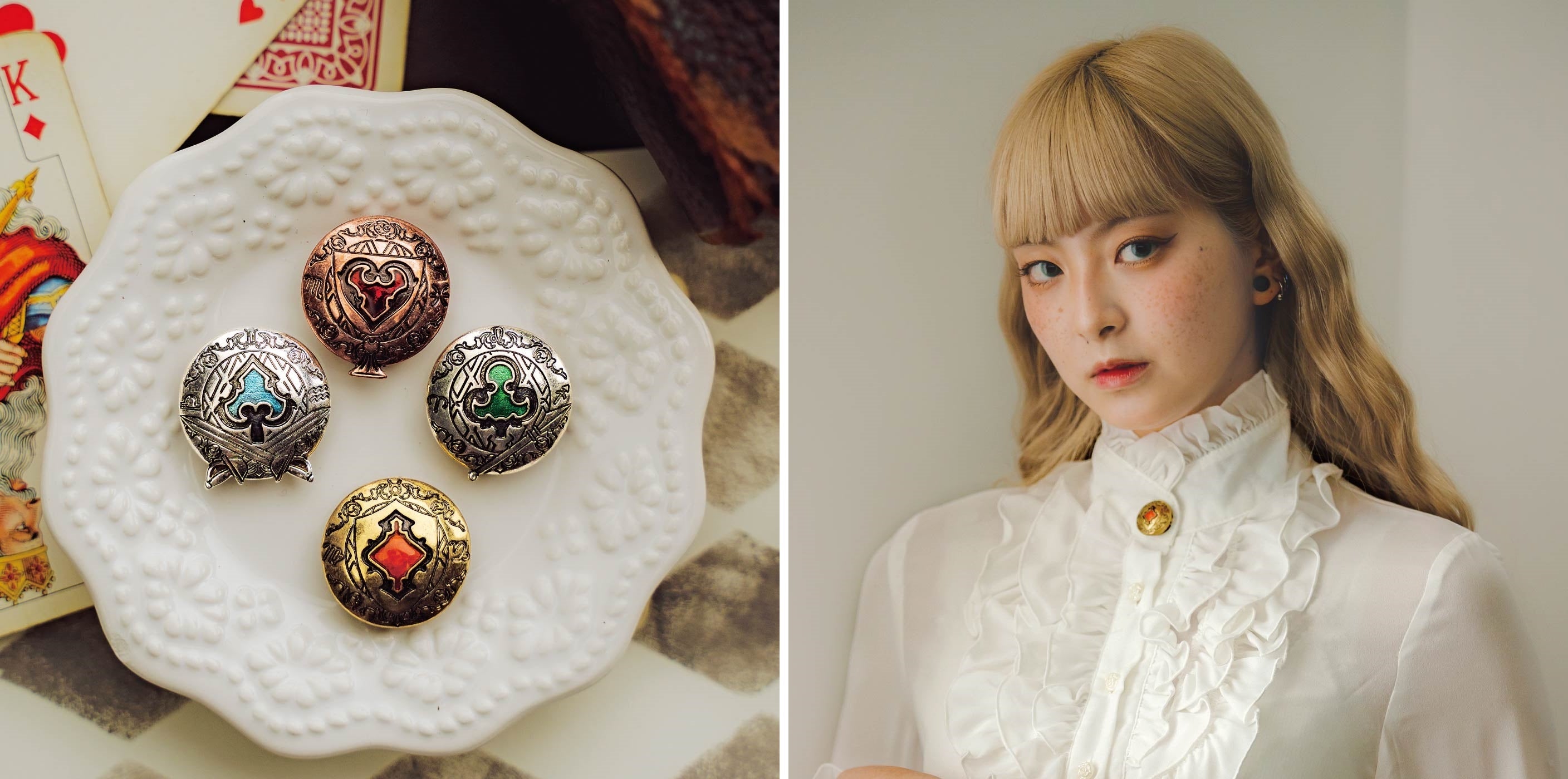 魔法少女の変身アイテム、魔法のブローチをイメージした、服のボタンにかぶせてブローチのように使えるボタンカバーです。衿もとや胸もと、袖口などにつけるだけで、クラシカルアンティークの雰囲気をまとえます。童話の少女を想起させるようなトランプの柄をもとに、勇気や誇りを誓う紋章をイメージさせるデザインです。