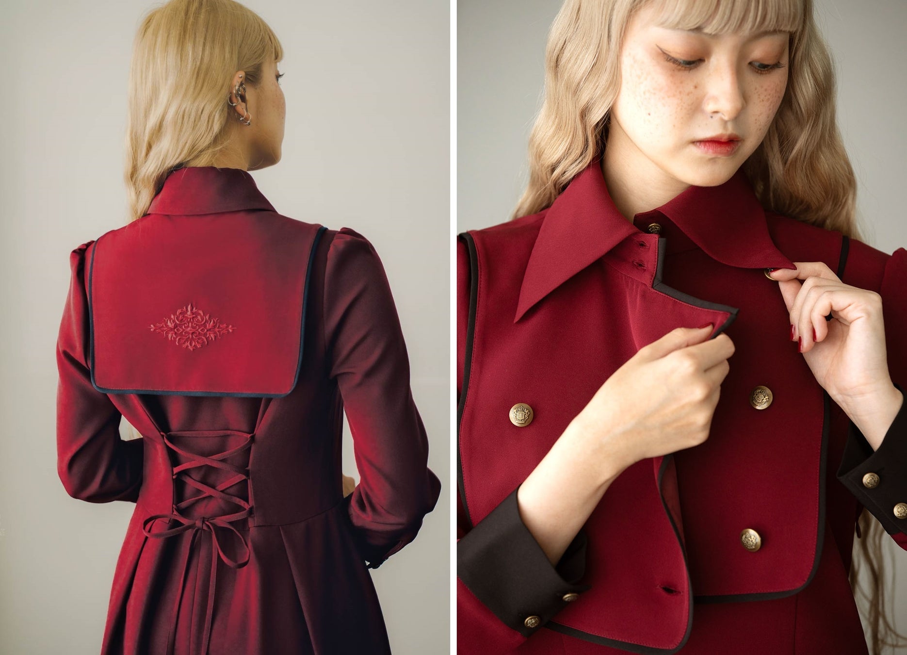 付け衿を着けることで、魔法の力が高まるときのコスチュームチェンジをイメージ。魔法学校の制服らしいパイピングやアンティーク調のフロントボタン、大きめの衿に加えて背中には魔法使いの証の紋章を同色系でさりげなく入れているのも魔法部のこだわりポイントです。背中の編み上げリボン、アンティーク調ボタンなど、ときめきをふんだんに盛り込んでいます。着脱は表側のアンティーク調のボタンだけではなく、裏側のボタンで簡単に胸もとにしっかりとフィットしてくれます。
