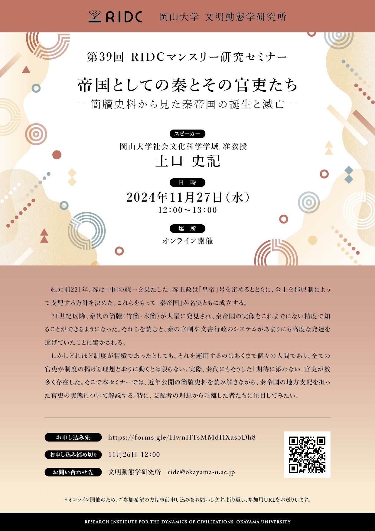 【岡山大学】高等先鋭研究院 文明動態学研究所 第39回RIDCマンスリー研究セミナー「帝国としての秦とその官吏たち―簡牘史料から見た秦帝国の誕生と滅亡―」〔11/27,水 オンライン〕