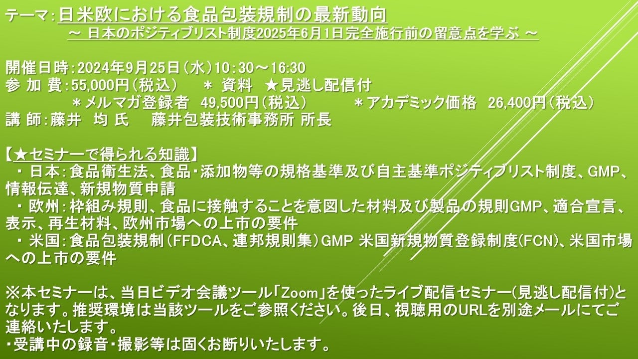【ライブ配信セミナー】日米欧における食品包装規制の最新動向 ~ 日本のポジティブリスト制度2025年6月1日完全施行前の留意点を学ぶ ~ 9月25日(水)開催 主催:(株)シーエムシー・リサーチ