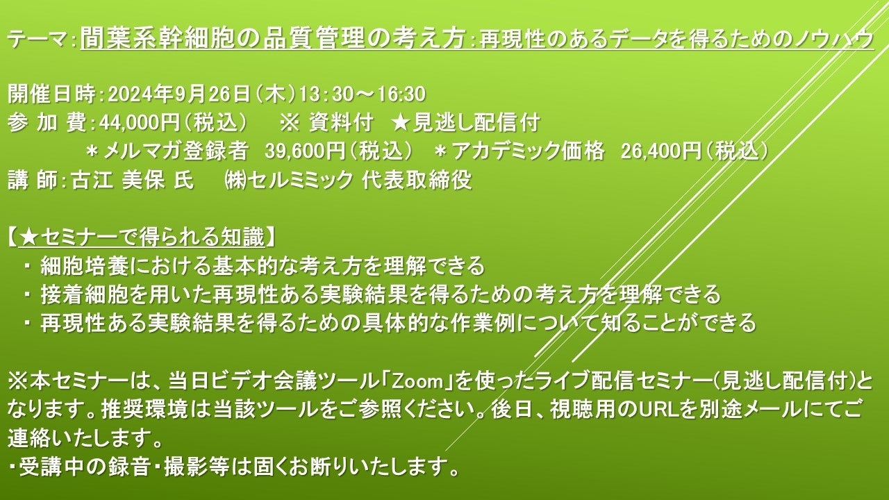 【ライブ配信セミナー】間葉系幹細胞の品質管理の考え方:再現性のあるデータを得るためのノウハウ 9月26日(木)開催 主催:(株)シーエムシー・リサーチ