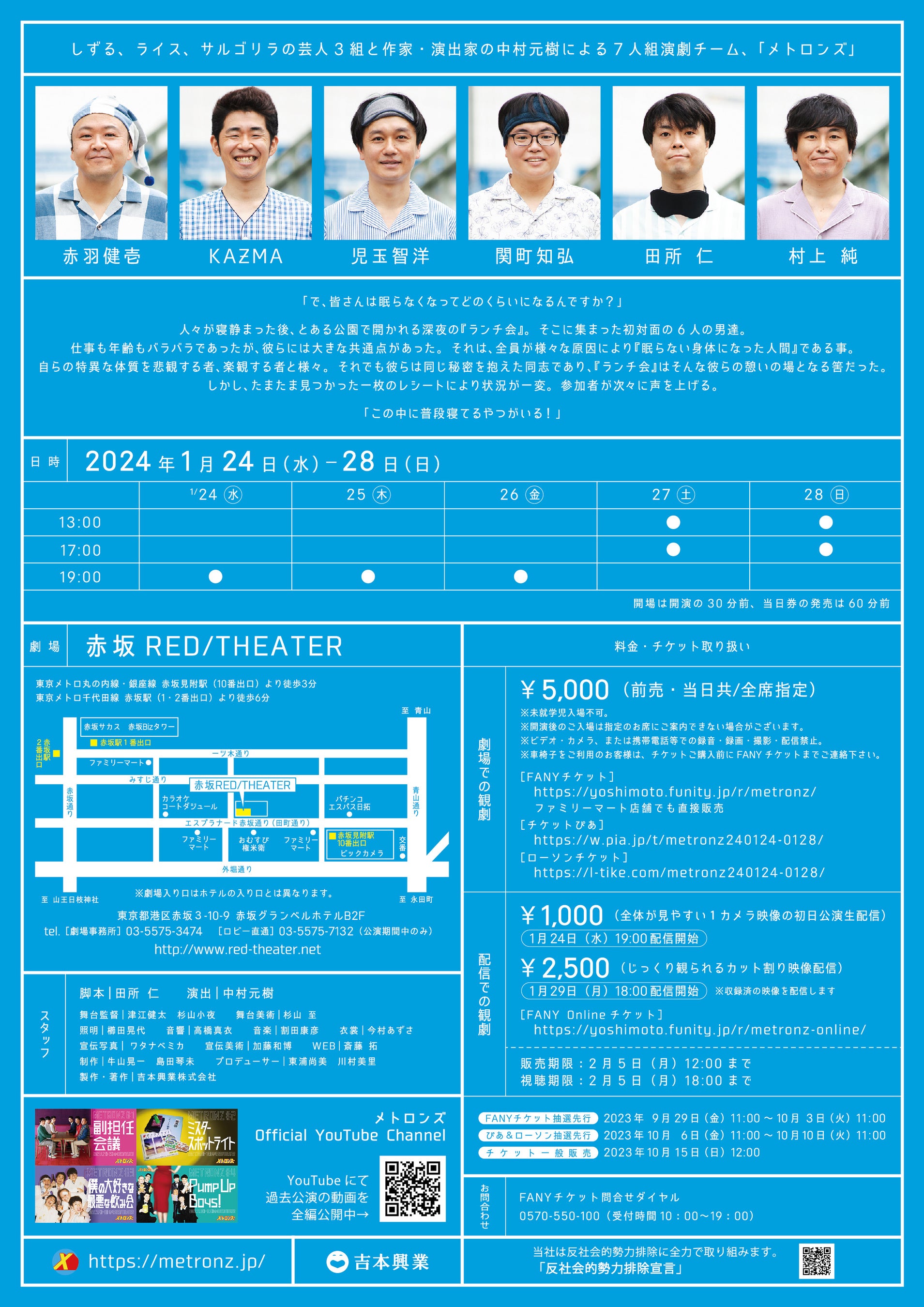 このたび、しずる、ライス、サルゴリラの芸人3組に、作家・演出家の中村元樹を加えた7人組演劇チーム“メトロンズ”による、2024年開催の第6回公演「寝てるやつがいる!」の追々加公演が決定しました。