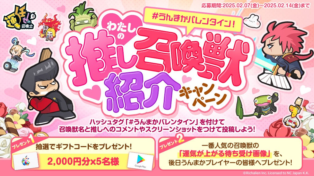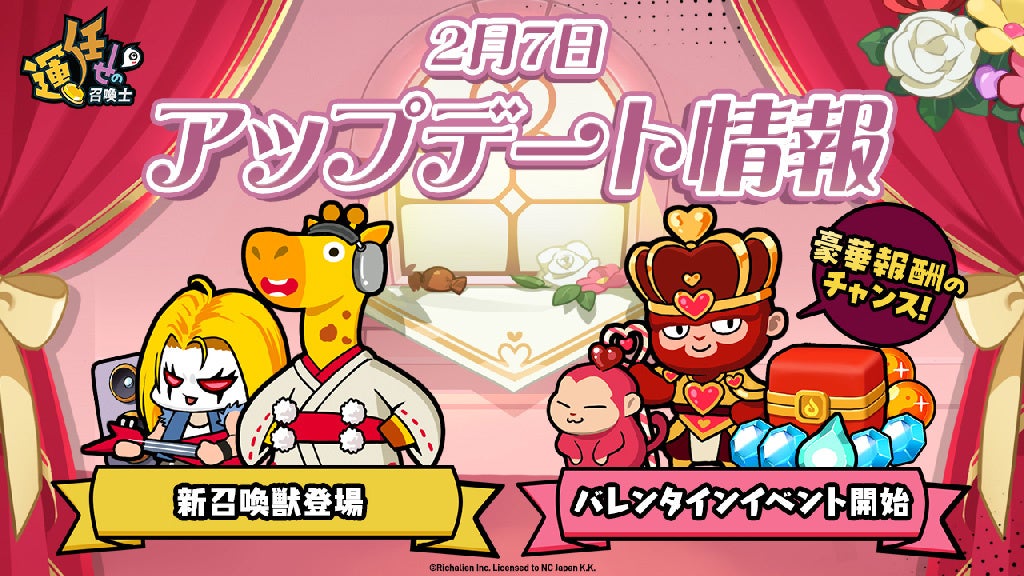 エヌ・シー・ジャパン株式会社(本社:東京都港区、代表取締役:林元基(イムウォンキ)、以下エヌシージャパン)は、カジュアルタワーディフェンスゲーム「運任せの召喚士」にて、2025年2月7日(金)に、新たな神話召喚獣2種の登場、および「バレンタインイベント」の開始をお知らせします。
