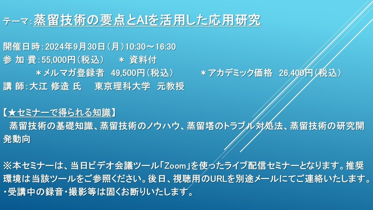 【ライブ配信セミナー】蒸留技術の要点とAIを活用した応用研究 9月30日(月)開催 主催:(株)シーエムシー・リサーチ