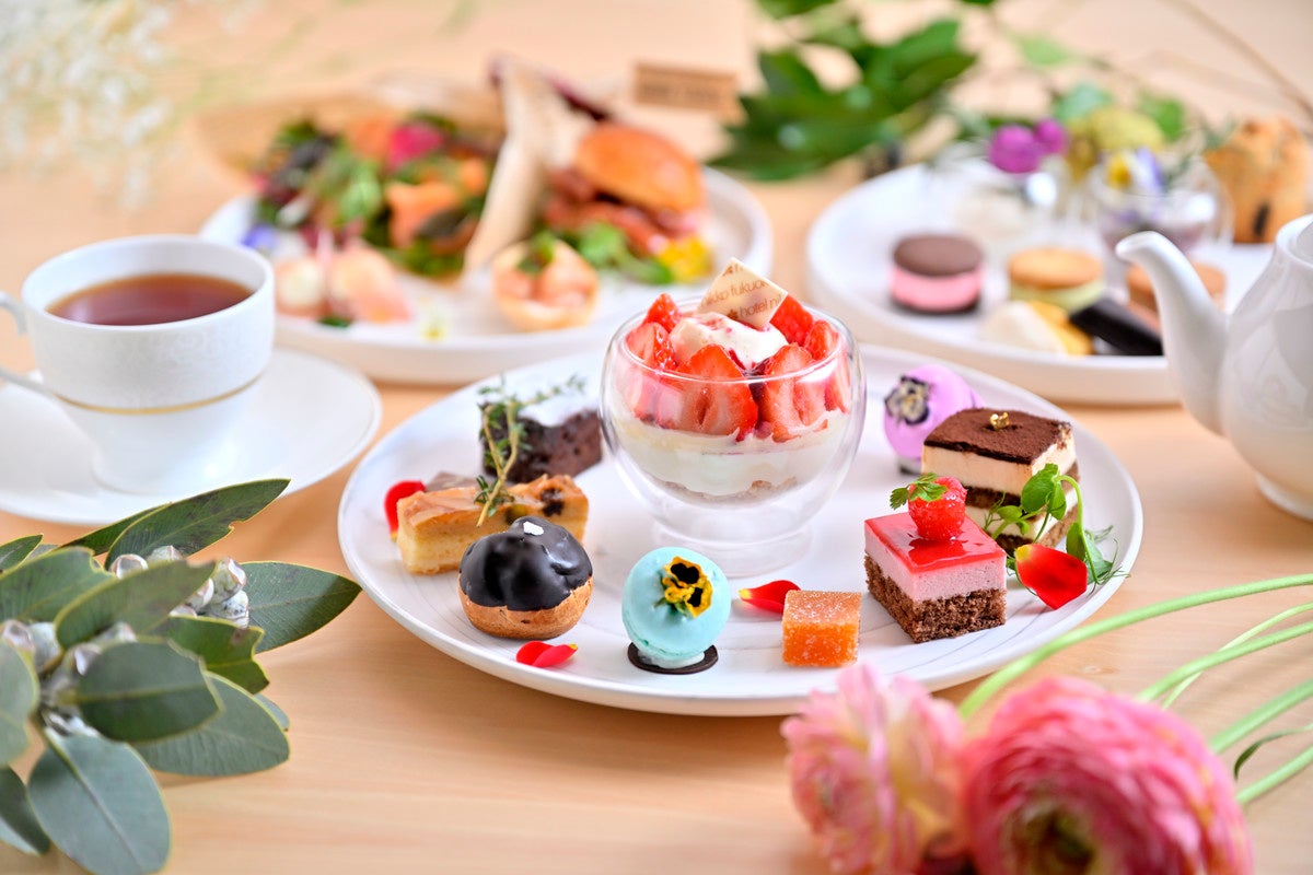 ホテルシェフたちによって引きだされた食材の良さが存分に詰まったスイーツと料理がお皿の上で咲き誇ります。今シーズンのメニューには苺がふんだんに敷き詰められた「フロマージュブランのムース 季節のフルーツとバニラアイスクリーム」や、数種類の旬野菜とサーモンで作った華やかな「自家製サーモンマリネの彩りブーケサラダ」、抹茶スコーンと苺のスコーンなど、旬の美味しさが詰まったアフタヌーンティーセットとなっております。季節の草花を楽しむように、花咲くスイーツでしばしの癒し時間をお楽しみください。