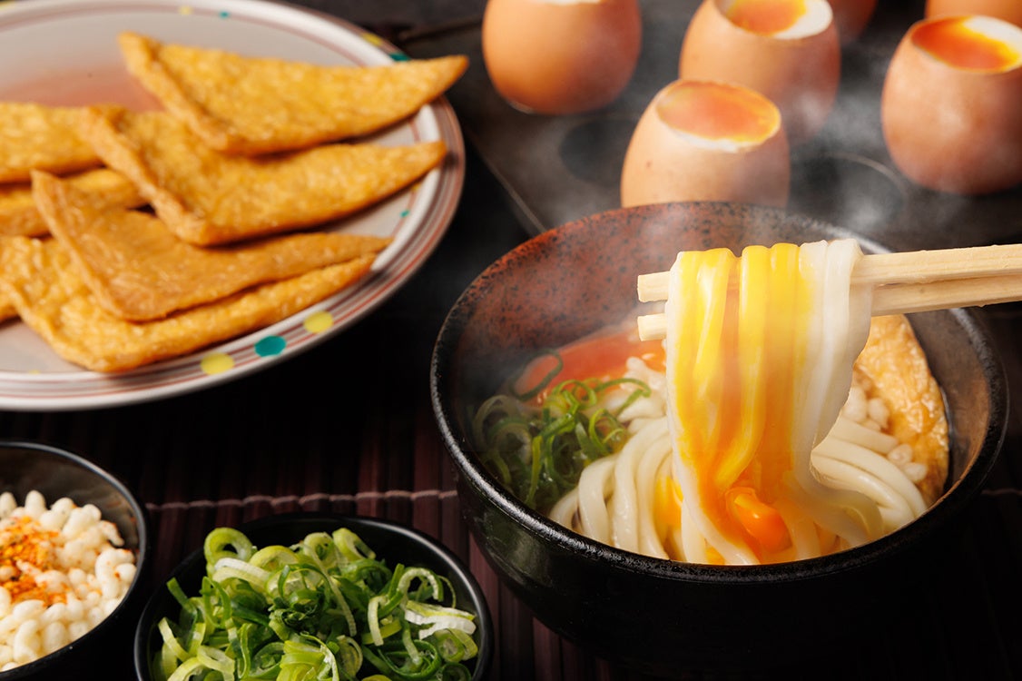 大阪の食文化には欠かせない“だし”の旨味が味わえる、大阪発祥と言われるきつねうどん。牛すじ肉を甘辛く煮込んだ郷土料理「どて焼き」や、大阪産「農の匠の玉子」の温度卵をトッピングするのもおすすめです。
