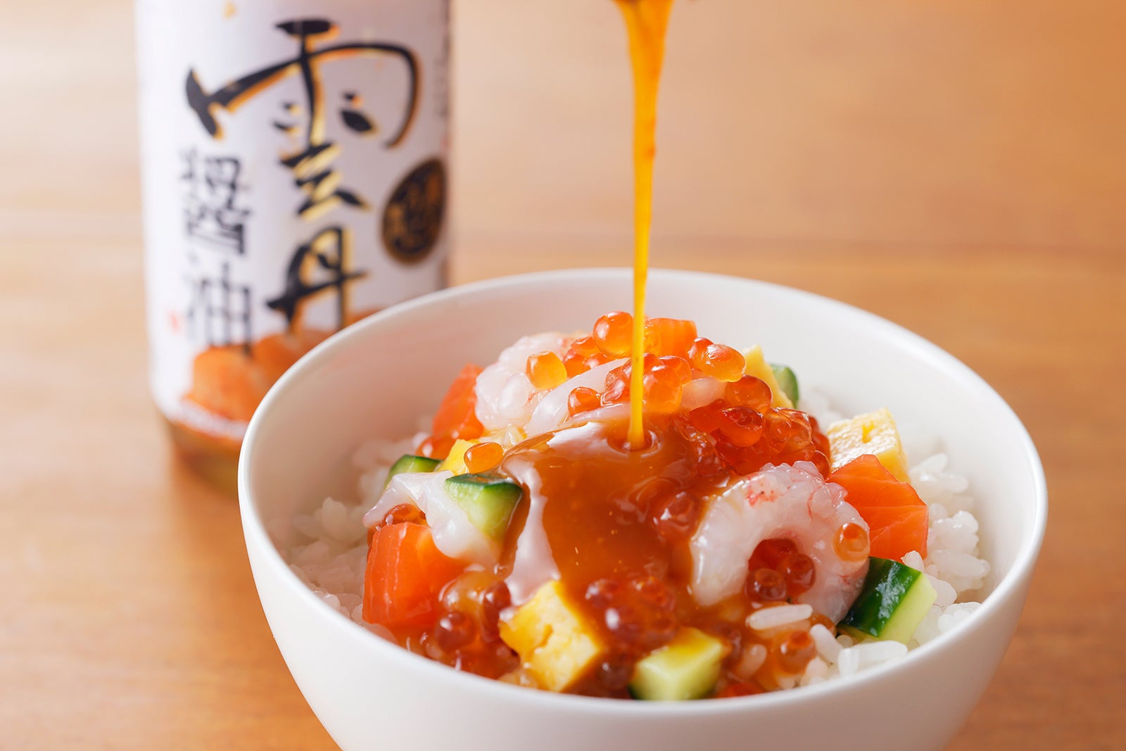 いくらや海老、サーモン、卵、きゅうりなどをミニグラスに入れてご提供します。濃厚な「雲丹しょうゆ」は、かけるとさらにリッチな味わいに。ミニサイズのグラスでご用意するので、1つだけお取りいただき少量味わうも良し、あったかごはんに沢山かけても良し。お好みの量・食べ方でお召し上がりいただけます。