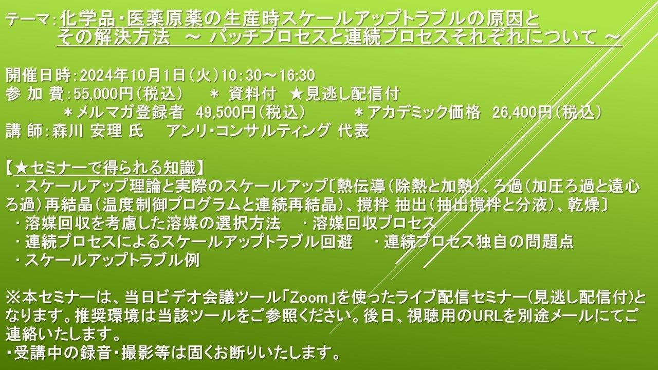 【ライブ配信セミナー】化学品・医薬原薬の生産時スケールアップトラブルの原因とその解決方法 ~ バッチプロセスと連続プロセスそれぞれについて ~ 10月1日(火)開催 主催:(株)シーエムシー・リサーチ