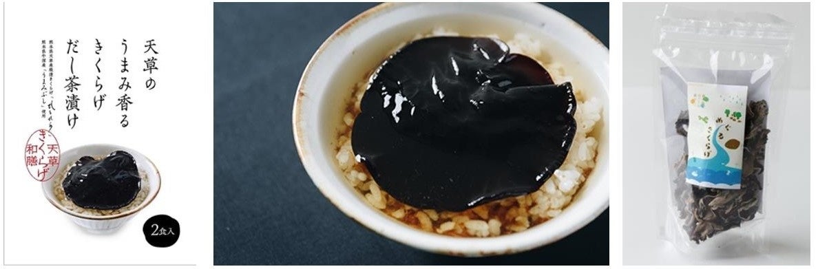 森林資源を活用し、自社製菌床をつくるところから始まる「ステップファーム」のキクラゲ栽培。天草の廃校で農薬を使わず育まれる生キクラゲは、肉厚でぷりぷりっとした食感が人気です。今回は特別に、自慢の菌床も数量限定で販売予定。ご自宅でキクラゲの収穫体験をお楽しみいただけます。また、生キクラゲのなかでも大きさや形など厳選された「ひとひら」を、「江良水産」のうまみぶしと赤酒、天草の天然塩で味付けした「だし茶漬け」も。あつあつのごはんに「ひとひら」をのせ、コクと旨味がいきたタレと熱湯をかけるだけで、極上の一杯が完成します。まさに、キクラゲの概念を覆す味わい。乾燥キクラゲを水で戻し、サラダや和えもの、汁物にも使える「めぐるきくらげ」は、日常や非常時に不足しがちな食物繊維を手軽に摂取でき、ローリングストックフードにもおすすめです。