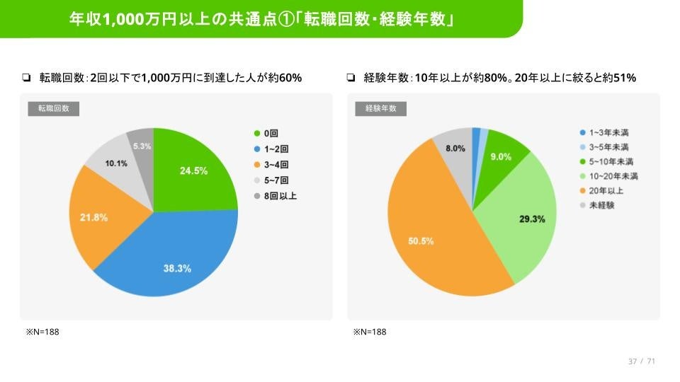 年収1,000万円超えプレイヤーの「共通点」と年収1,000万円未満との「違い」について調査したところ、2回以下の転職回数で1,000万円に到達した人が約60%という結果に。経験年数に関しては、10年以上が約80%。20年以上に絞ると約51%という結果だった。