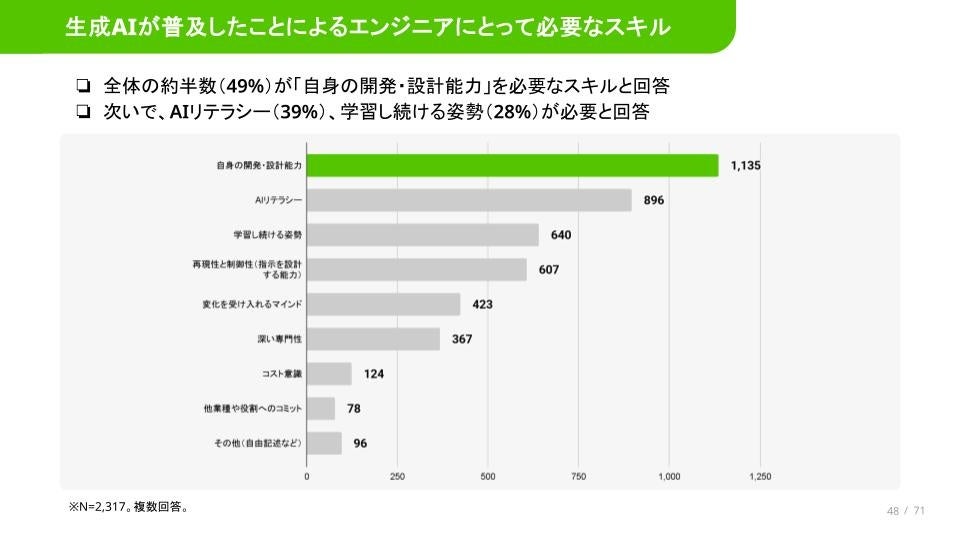 「生成AIが普及したことによるエンジニアにとって必要なスキルを教えてください。複数選択(最大2つ)」という質問に対して、全体の約半数(49%)が「自身の開発・設計能力」と回答。次いで、AIリテラシー(39%)、学習し続ける姿勢(28%)が必要と回答。