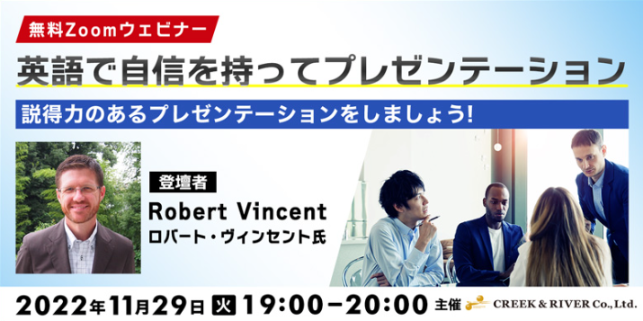 株式会社クリーク・アンド・リバー社(C&R社)は11月29日(火)、グローバル企業で働きたい方を対象に、無料のオンラインセミナー「英語で自信を持ってプレゼンテーション ~説得力のあるプレゼンテーションをしましょう!~」を開催いたします。
