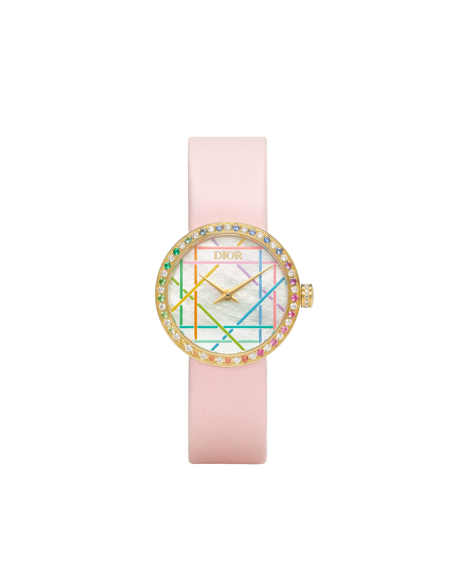秘密のお守りでもあり、コレクターズアイテムでもある同タイムピースより登場する新モデルは、虹色の光沢に溢れるマザーオブパールのダイアルが、メゾンを象徴するパターンの幾何学的な抽象性に活気をもたらします。また、再解釈へのオマージュとして、レインボー*モデルも登場し、まるでしなやかなリボンが光をとらえるかのように、多様な光彩を放ちます。サファイア、アメシスト、ツァボライト、トルマリン、そして、エメラルドをあしらった、煌めきに溢れるレインボーモデルには、ピンク サテン ストラップが配されます。