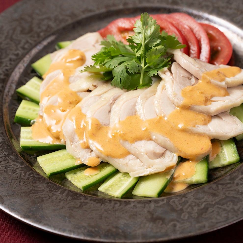 鶏もも肉を、紹興酒、葱、生姜などを入れた調味液に1日漬けて低温で加熱することで、しっとりとした仕上がりになっています。濃厚な胡麻ソースをたっぷりつけてお召しあがりください。