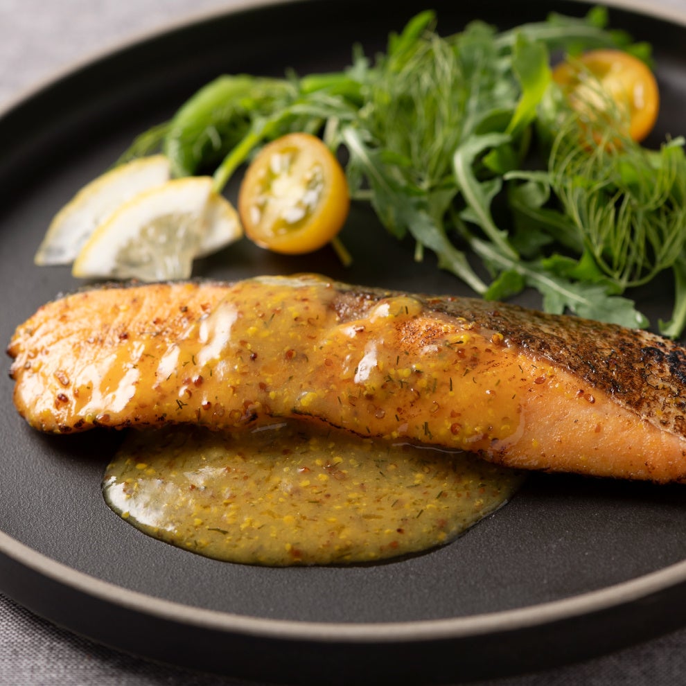 脂が乗ったサーモンとマスタード風味のソースがピッタリ!はちみつの甘みを加えることで風味豊かなソースになっています。しっかりと骨抜きがされているのも嬉しいところです。