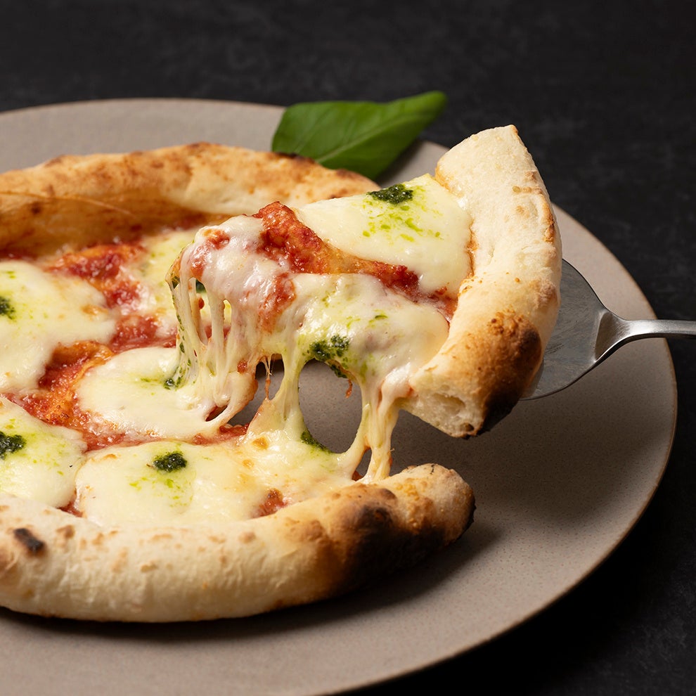 生地の食感にこだわり、職人さんが1枚ずつ手で伸ばし、焼きあげています。この地道な手間によって生地に気泡が入り、もっちりした食感になります。2種類のチーズとソースの相性が絶妙なピザです。