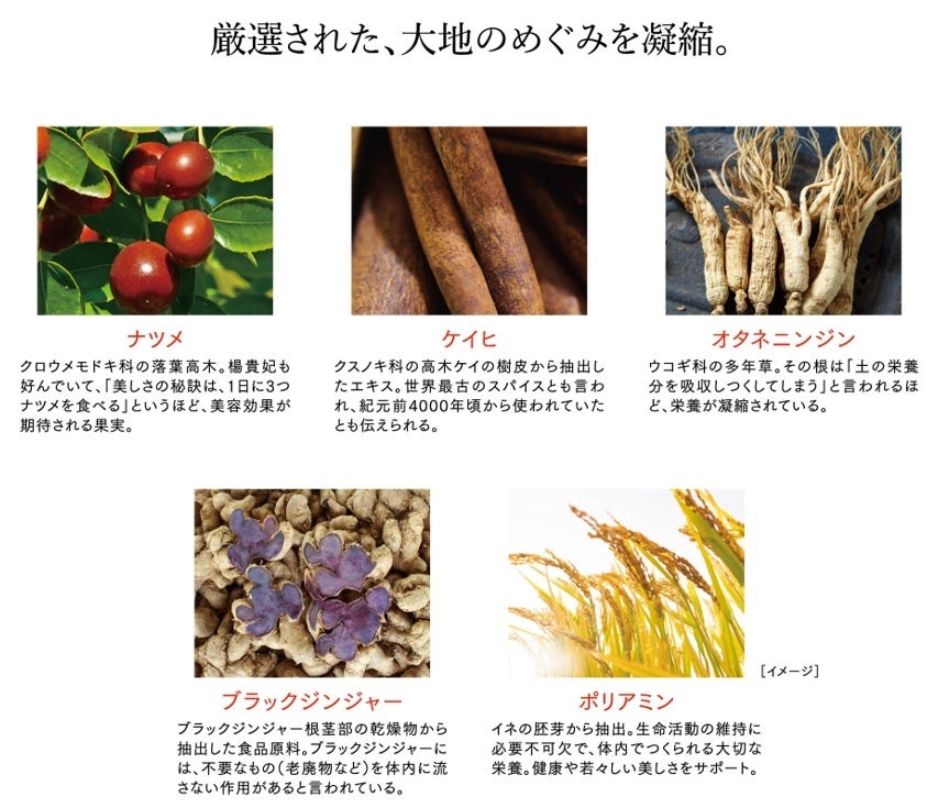 肌・からだ・心のつながりに着目し、「ナツメ、ケイヒ、オタネニンジン、ポリアミン」など選りすぐりの大地からのめぐみを配合。1日2粒の習慣で、うるおいあふれる毎日へと導きます。