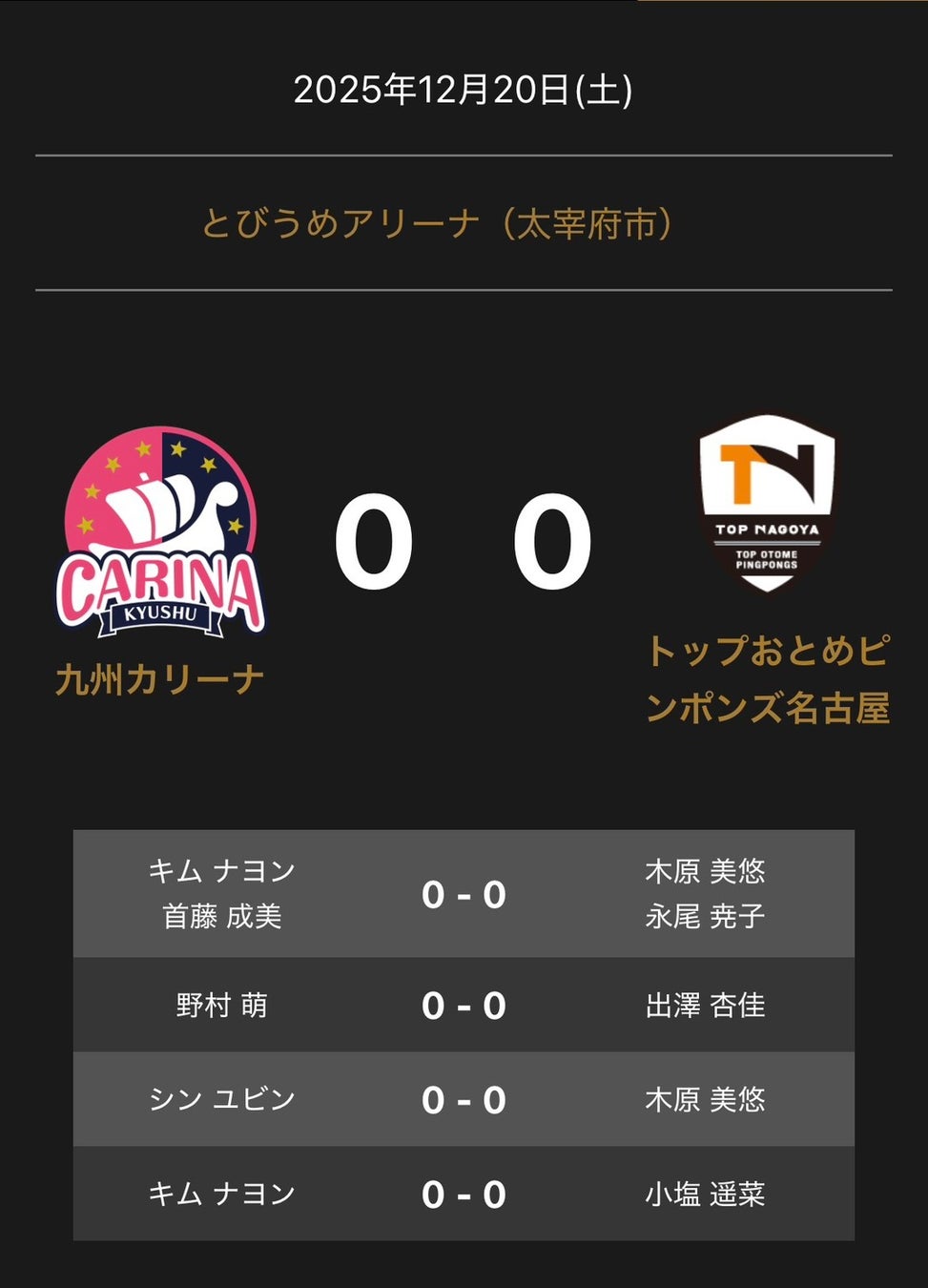 ノジマTリーグ 2025-26シーズン 公式戦 12月20日開催 九州カリーナvsトップおとめピンポンズ名古屋 対戦オーダー発表