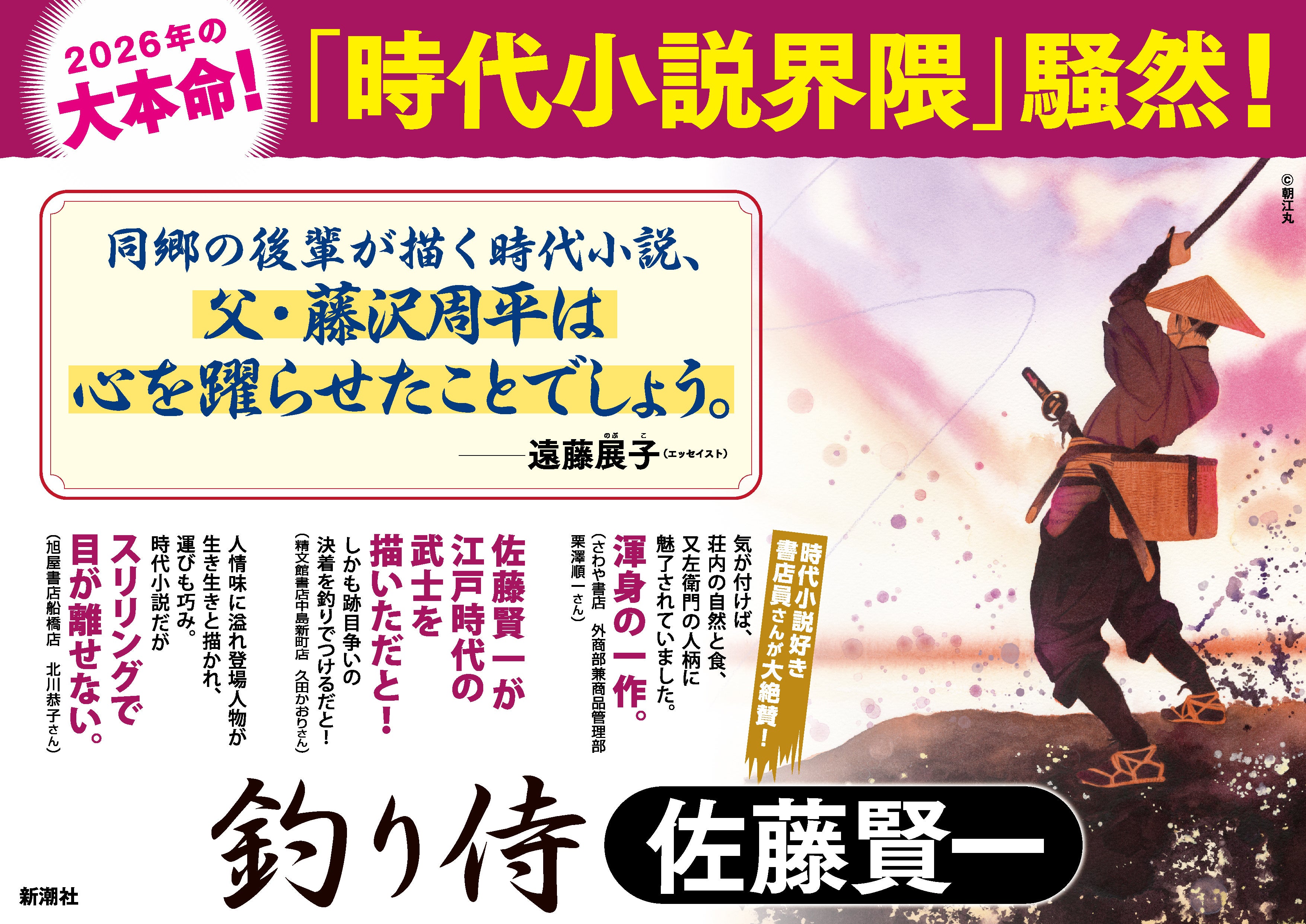 『小説フランス革命』『ナポレオン』など西洋史を材に取った歴史小説の第一人者、佐藤賢一さんがはじめて描く時代小説『釣り侍』(読み:つりざむらい)がこのほど、新潮社より刊行されました。これを記念し、雑誌「波」3月号の表紙に、”釣り侍”に扮した佐藤賢一さんが登場します。佐藤さんは「意外と動きやすい。着くずれることもない。これなら本当に海まで歩いていけそう」とコメント。同誌では村山由香さんと佐藤賢一さんのスペシャル対談に加え、文芸評論家・池上冬樹さんによる『釣り侍』書評も掲載しております。ぜひお近くの書店でお求めください。