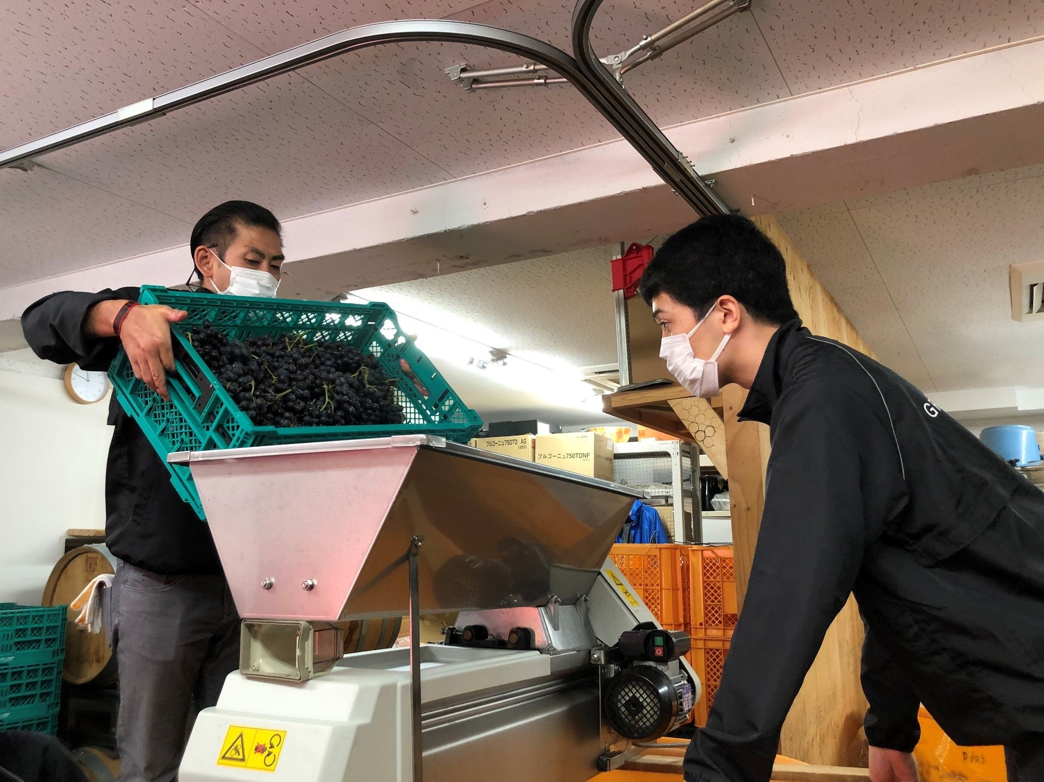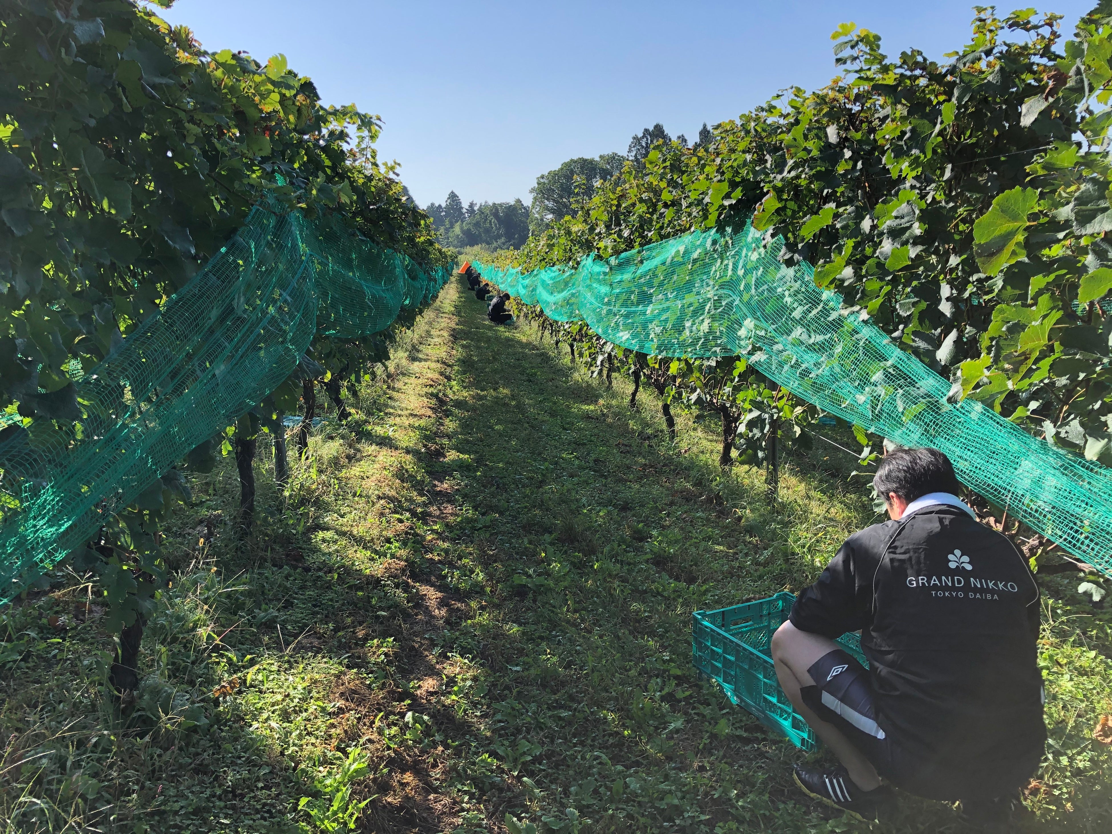 グランドニッコー東京 台場と深川ワイナリーは2017年より共同でプライベートワイン造りに取り組んでおり、2022年は長野県・安曇野「ぼーのふぁーむ明科」のぶとう畑で収穫を行いました。