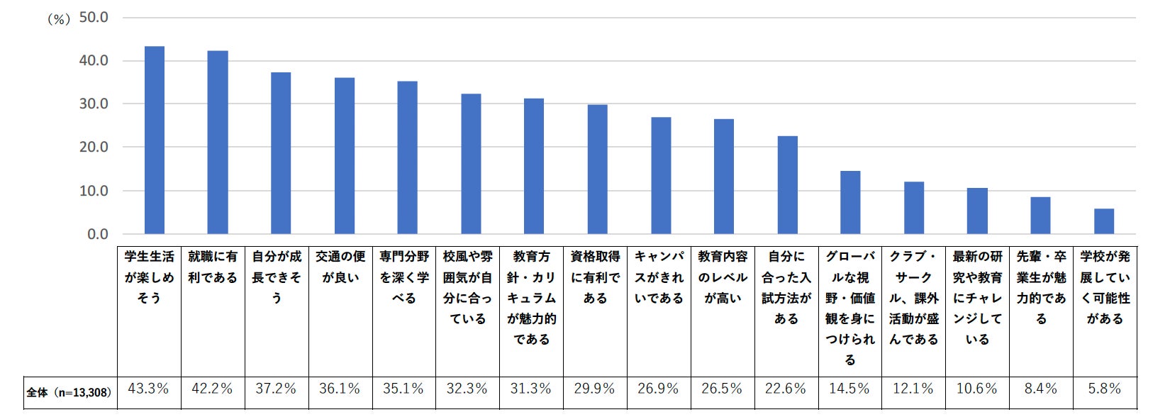 全国的な傾向としては、「学生生活が楽しめそう」が43.3%と1位。大学卒業後の生活を意識した「就職に有利である」(42.2%)が続き、「自分が成長できそう」(37.2%)が3位でした。この結果から、大学卒業後のキャリアを見据えて在学中に自身がどれぐらい成長できるかなど、大学生活のその先を見通している高校生の志向が見えてきました。