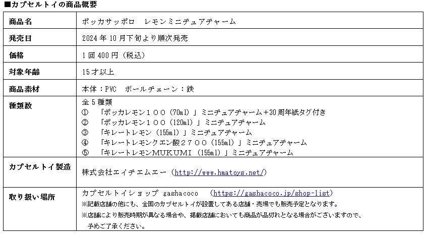 サッポロホールディングス(株)のグループ企業であるポッカサッポロフード&ビバレッジ株式会社(代表取締役社長:時松浩、本社:愛知県名古屋市)は、10月5日の「レモンの日」にちなみ、ロングセラーブランドである「ポッカレモン100」及び「キレートレモン」から、5種類のミニチュアチャームを展開します。ミニチュアチャームは全国のカプセルトイ取り扱い店にて2024年10月下旬から順次販売されます。