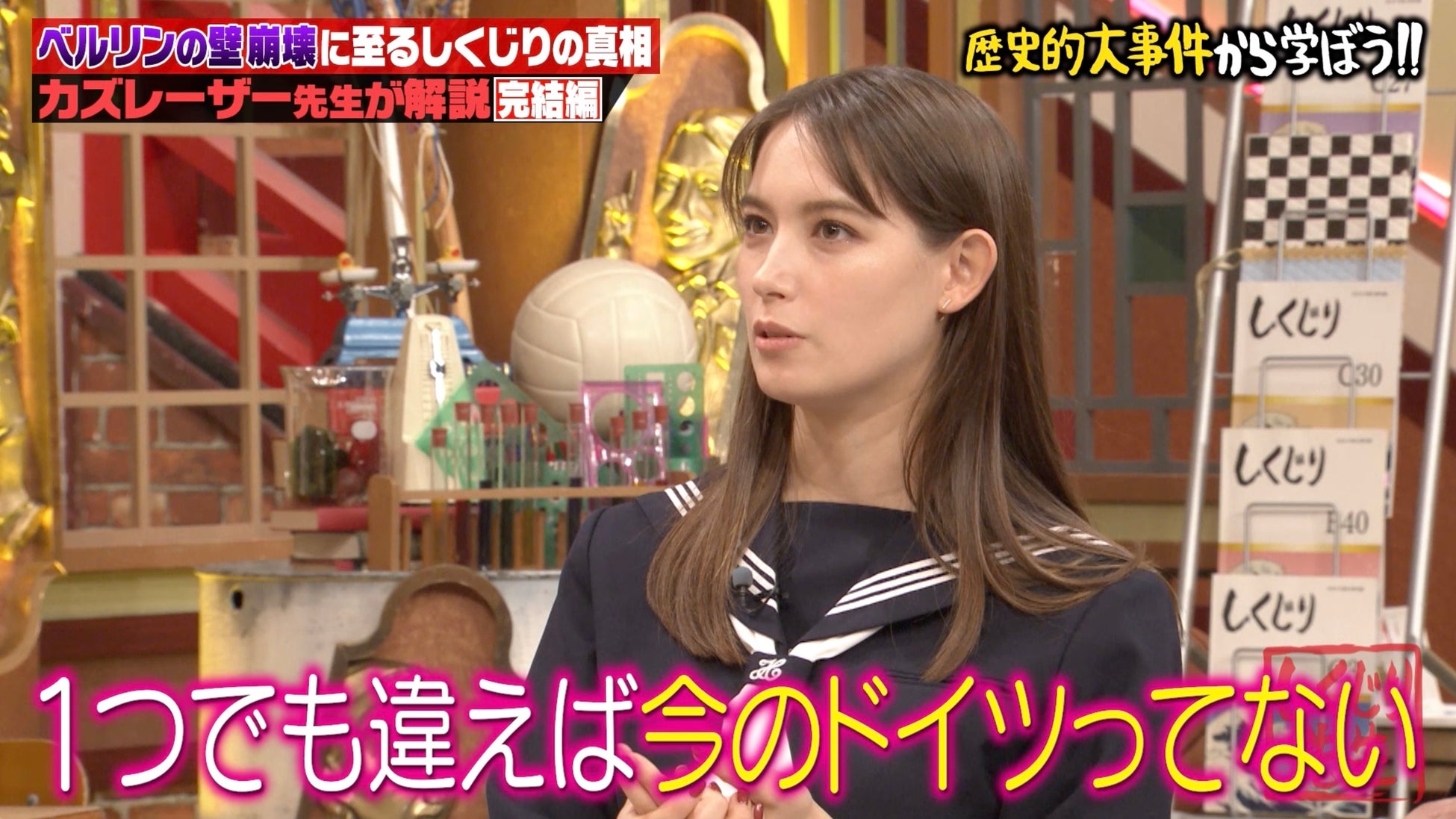 そして、混乱がピークに達し、暴動寸前という状況の中、決断を迫られた現場責任者のイエーガーは、会見から約5時間後の午後11時30分頃、独断で「ベルリンの壁のゲート開放」を決断。“ベルリン”の壁は事実上崩壊しました。ここまでの授業をきき、生徒役で出演したモデルでタレントのトラウデン直美は「1つでも違えば今のドイツはない」「普通にいる人たちなのに、世界変えちゃったっていうのが不思議」とコメントしました。