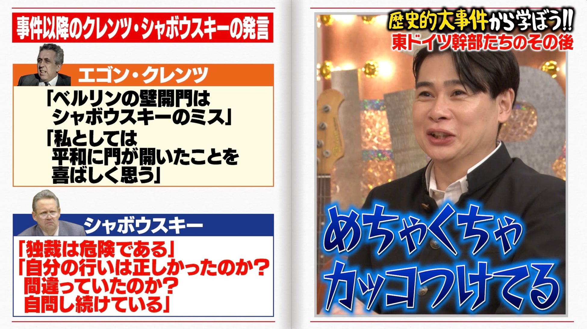 その後、東ドイツの指導者、エゴン・クレンツは収監。一方、同じく刑務所に収監されるも、恩赦で釈放となったシャボウスキーは“東西ドイツを統一した英雄”として扱われることに。シャボウスキー本人の発言として「自分の行いは正しかったのか?間違っていたのか?自問し続けている」と紹介されると、お笑いコンビ・平成ノブシコブシの吉村崇は「めちゃくちゃカッコつけてる」とツッコミを入れました。
