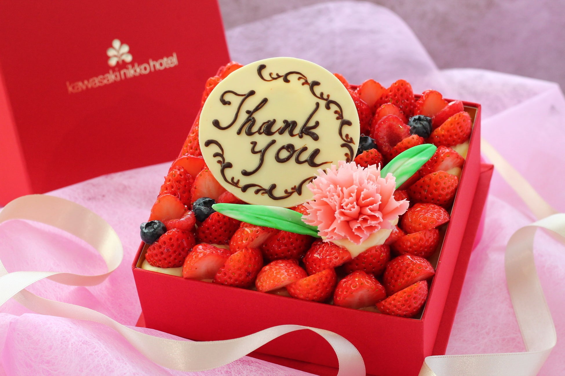 当ホテルのエグゼクティブシェフパティシエ馬場園安秀が、毎年手がける母の日のオリジナルケーキ。特に本年おすすめするのは、プレミアムケーキの「コフレ・フレーズ・ママン」です。母の日のためにオリジナルで作ったボックスの中に、サクサクのタルト生地、北海道産生クリームと川崎産卵を使ったバニラクリーム、ふわふわのスポンジを層に重ね、苺を箱いっぱいにしきつめました。箱を開けた瞬間のお母さんの笑顔を想い、宝石箱のように美しくデコレーションしたケーキです。