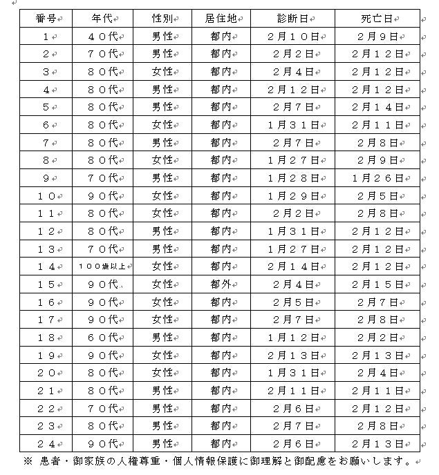 都内で新型コロナウイルスに感染した方が死亡されましたのでお知らせします。