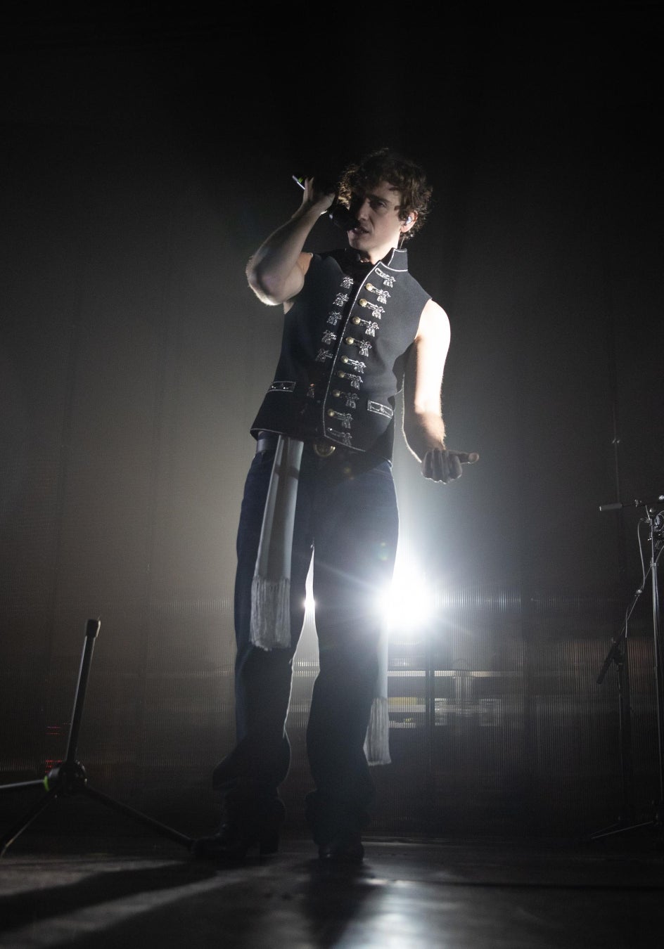 ギタリカデラフエンテは、ブランデンブルク刺繍があしらわれたブラックウールのオフィサーカラーベストに、ブルーのジーンズを合わせました。また、ホワイトシルクスカーフ、ブラックレザーのメダリオンベルト、そしてブラックレザーのダービーシューズを着用しました。