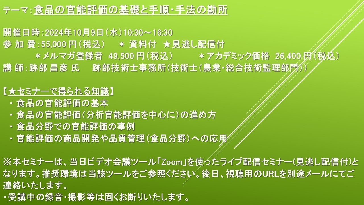 【ライブ配信セミナー】食品の官能評価の基礎と手順・手法の勘所 10月9日(水)開催 主催:(株)シーエムシー・リサーチ