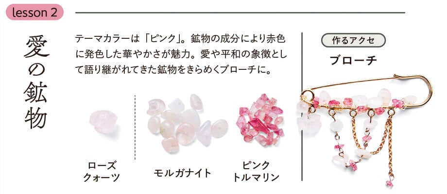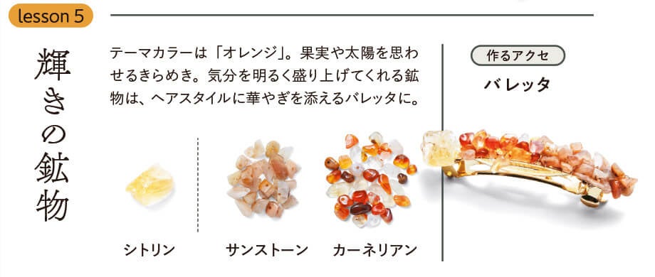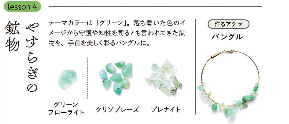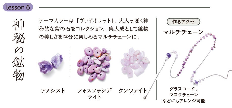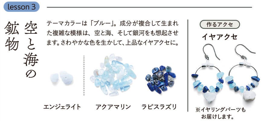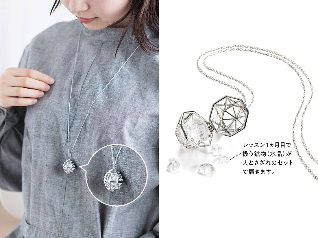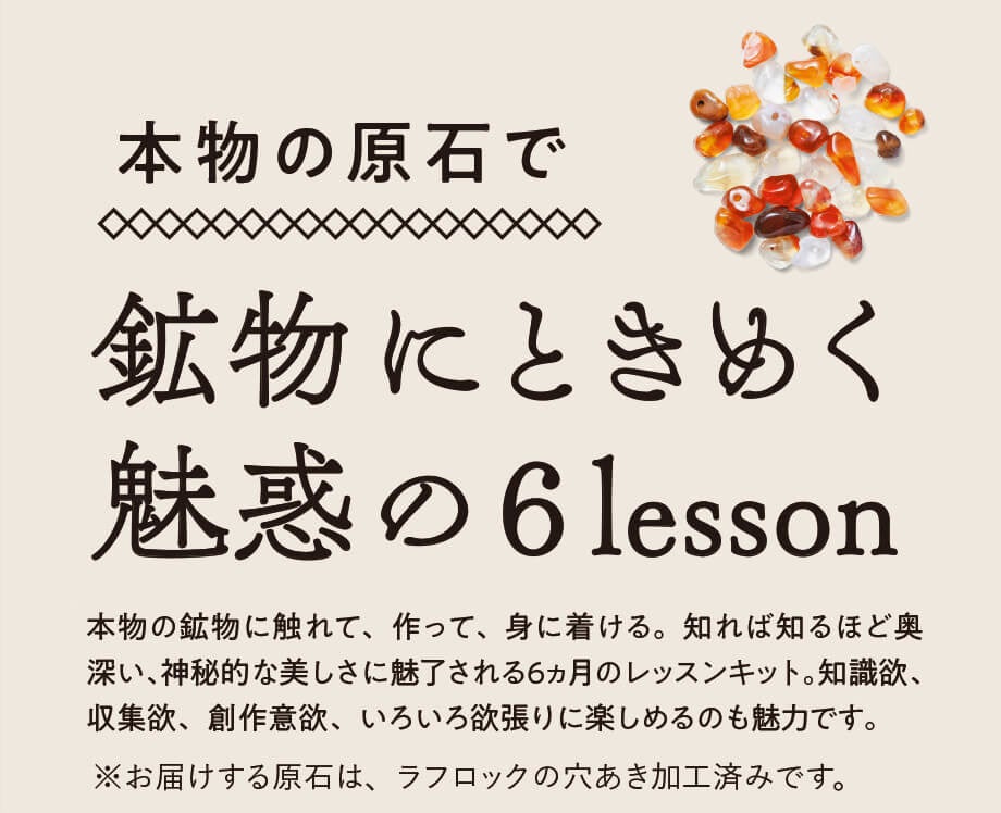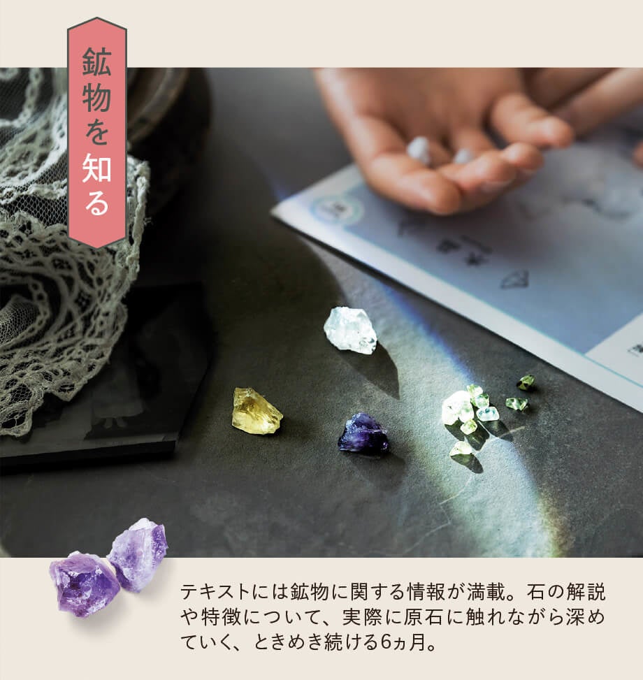 「知る」「触れる」「形づくる」という工程を通して、自分だけの鉱物の世界を広げる6ヵ月のレッスンプログラムです。分類や成分といった博物学的な基礎知識、伝承されてきた物語などを学べるテキストと、色とテーマをもとにした3種の鉱物が届きます。まずテキストを通して鉱物について「知る」ことから始め、指先でじっくりと確かめる「触れる」という体験で、見るだけではわからない感動を味わい、鉱物への理解を少しずつ深めていきます。また、気になる鉱物があれば、お守り感覚でアクセサリーに「形づくる」ことが可能です。必要な材料やパーツは毎月セットで届くので、初心者でも手軽にアクセサリーを作れます。