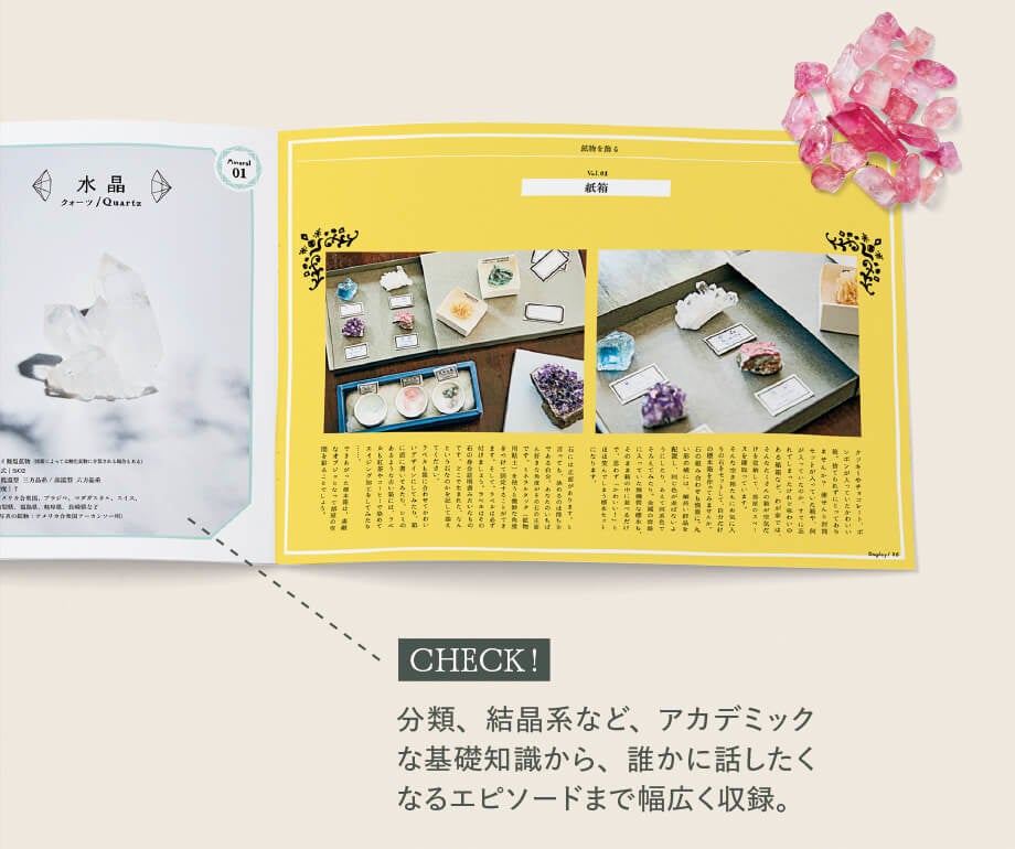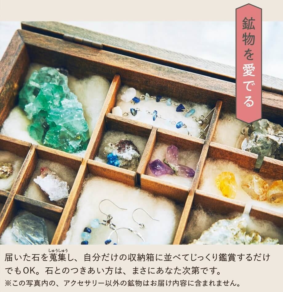 自分だけの収納箱に並べて観察したり、手で触れてみたり、届いた鉱物の愛で方は自由です。そういった鉱物の楽しみ方についても紹介しています。