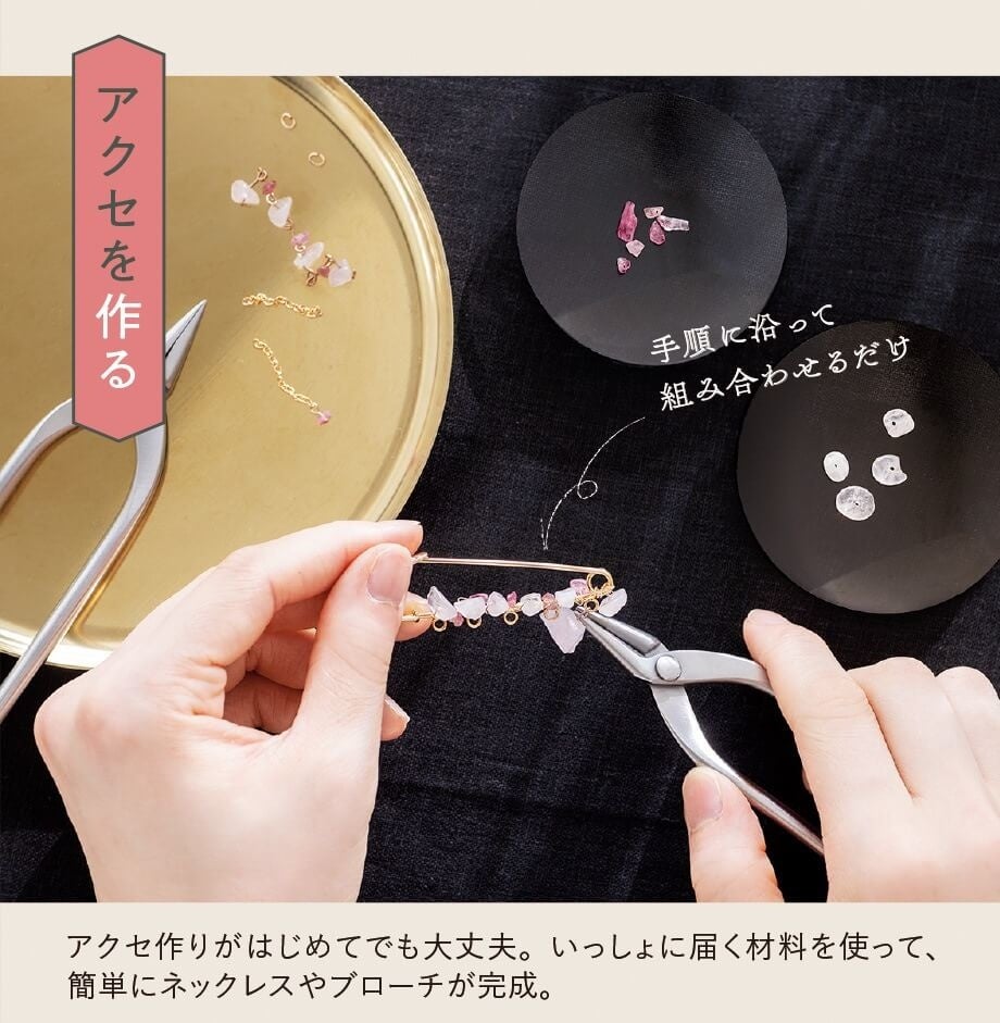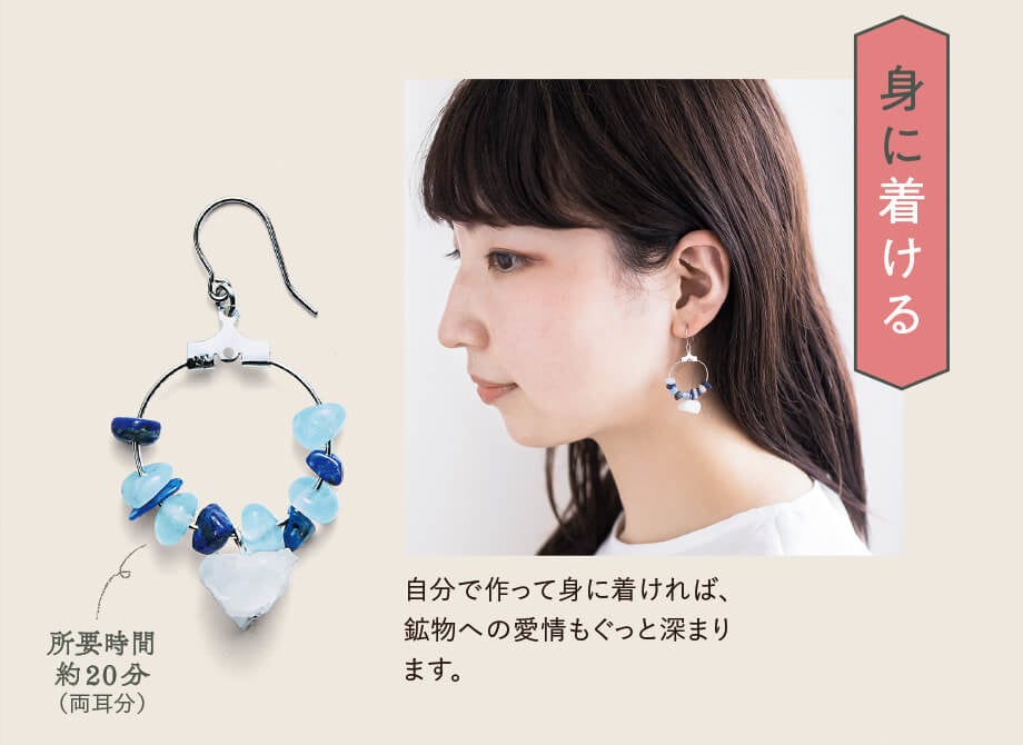 お気に入りの鉱物を使って、アクセサリーを作ることができます。毎月異なる鉱物が届くので、さまざまなアクセサリー作りを楽しむことができます。