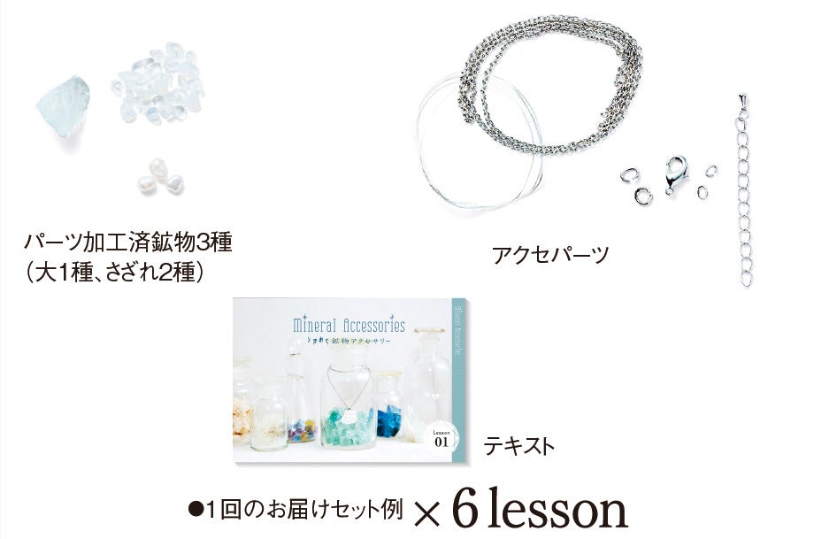 1回のお届けセット例です。テキストと一緒に、パーツ加工された鉱物3種と、ネックレス、ブローチ、イヤリングなど、その月のアクセサリーに使うパーツが届きます。