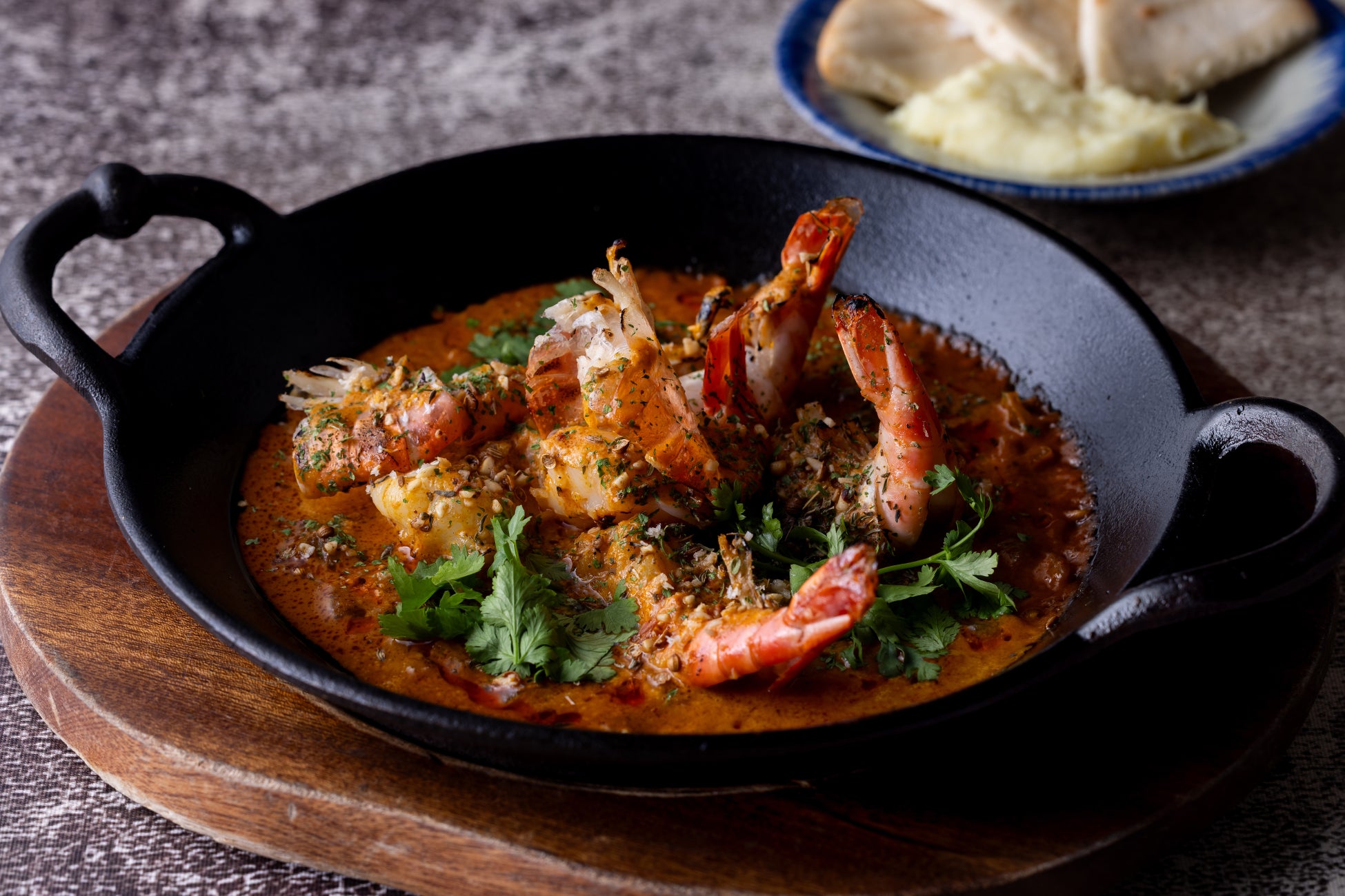・オニテナガエビのグリル ピタパン&マッシュポテト添え(2,480円):ぷりっと焼き上げたオニテナガエビに、フルーツチャトニーを加えたココナッツカレーソースをかけた一品。ピタパンやマッシュポテトをディップして、ピタパンやマッシュポテトをディップして、シェアにもぴったり。