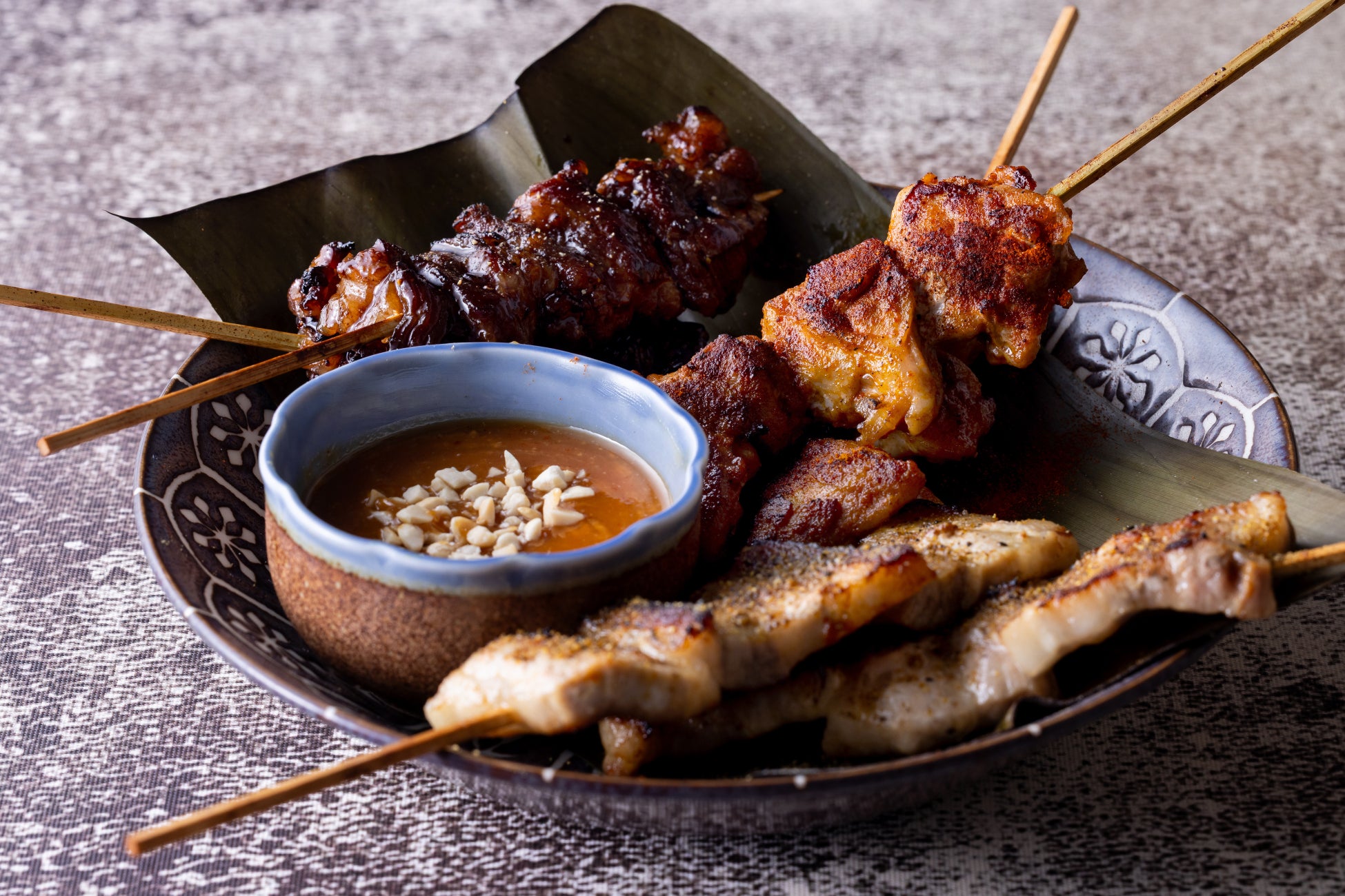 ・サテー3種盛り(牛肉・豚肉・鶏肉 各2P 1,980円):香ばしい肉の旨みに、濃厚なピーナッツチャトニーを合わせるのがおすすめ。甘みとコクが加わり、より深い味わいに。