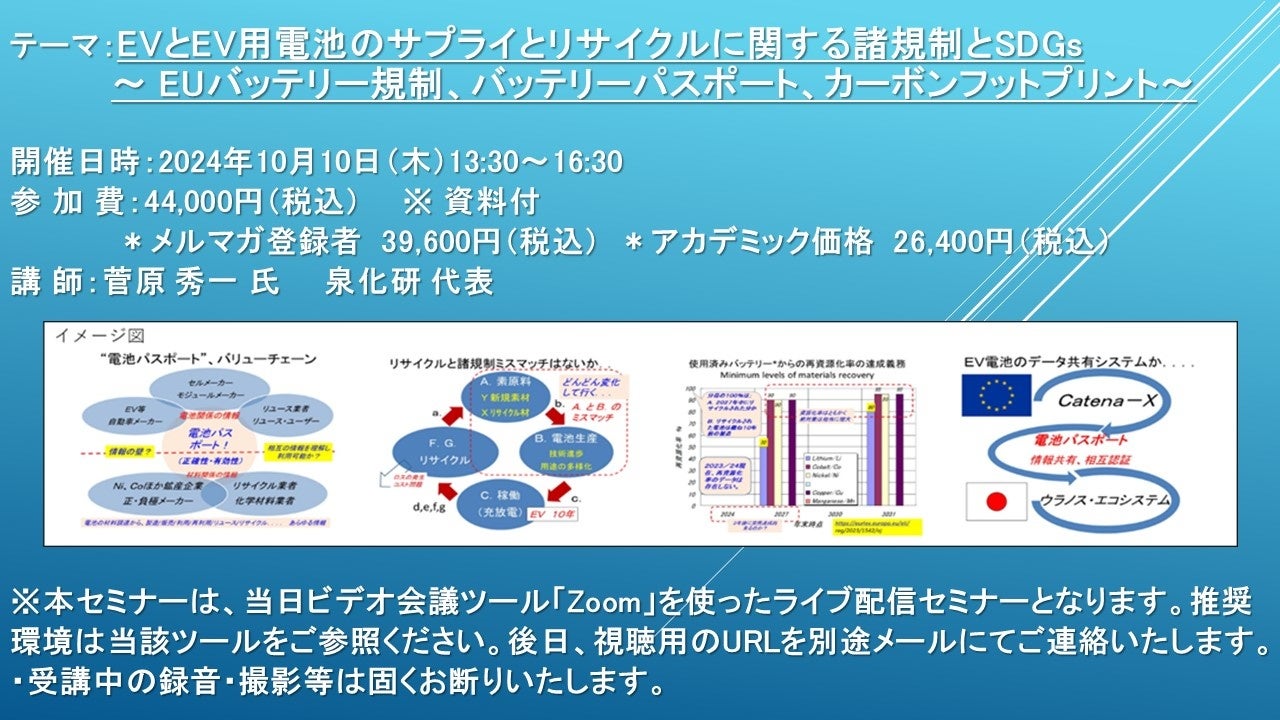 【ライブ配信セミナー】EVとEV用電池のサプライとリサイクルに関する諸規制とSDGs ~ EUバッテリー規制、バッテリーパスポート ~ 10月10日(木)開催 主催:(株)シーエムシー・リサーチ