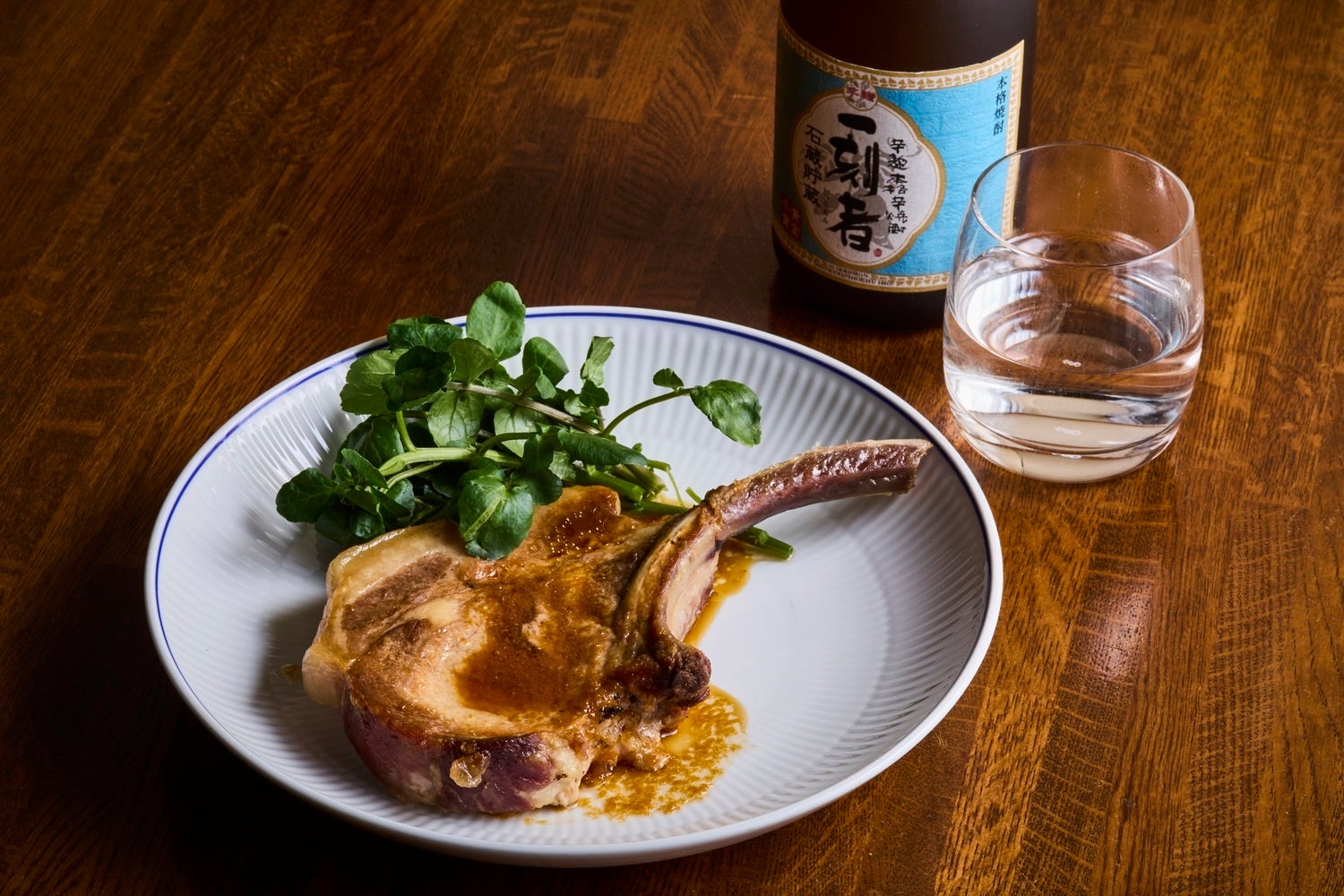 芋焼酎のお湯割りとポークチョップソテー。ジューシーで柔らかなポークに芋焼酎を加えたソースが合う。