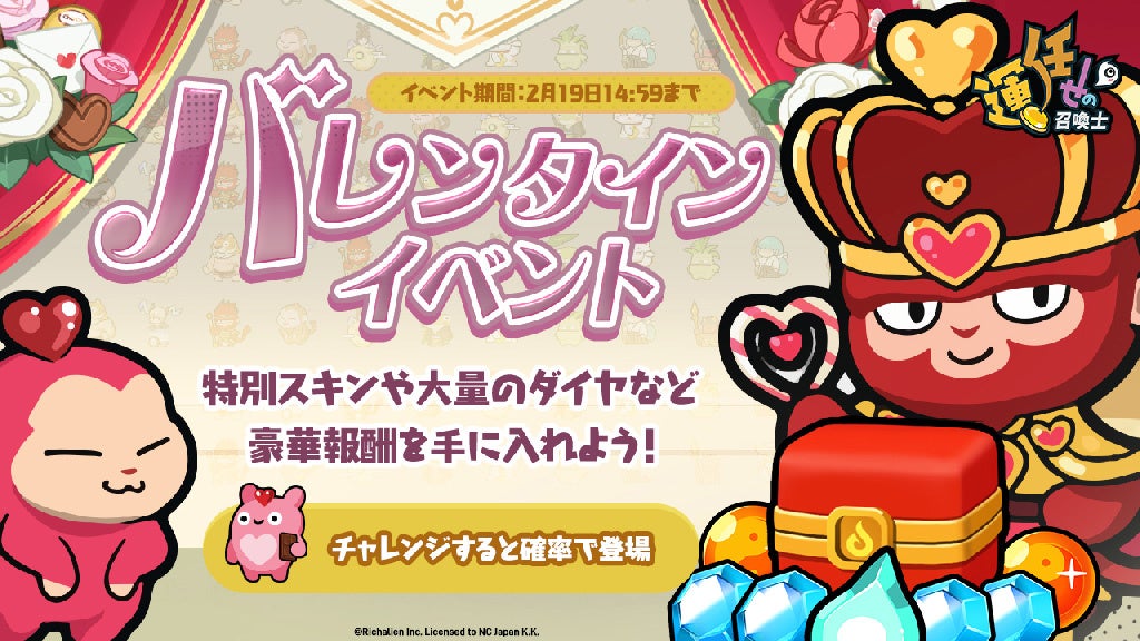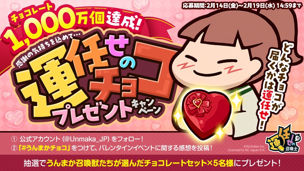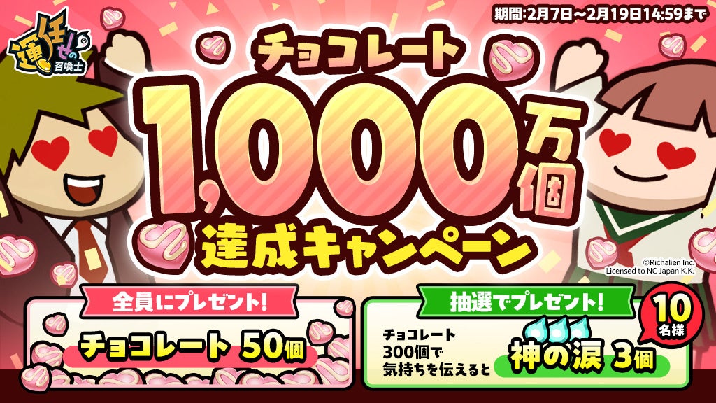 エヌ・シー・ジャパン株式会社(本社:東京都港区、代表取締役:林元基(イムウォンキ)、以下エヌシージャパン)は、カジュアルタワーディフェンスゲーム「運任せの召喚士」にて、2025年2月14日(金)に現在開催中のバレンタインイベントで累計1,000万個のチョコレートが贈られたことを記念したキャンペーンの開催、および次回アップデート予告の公開をお知らせします。