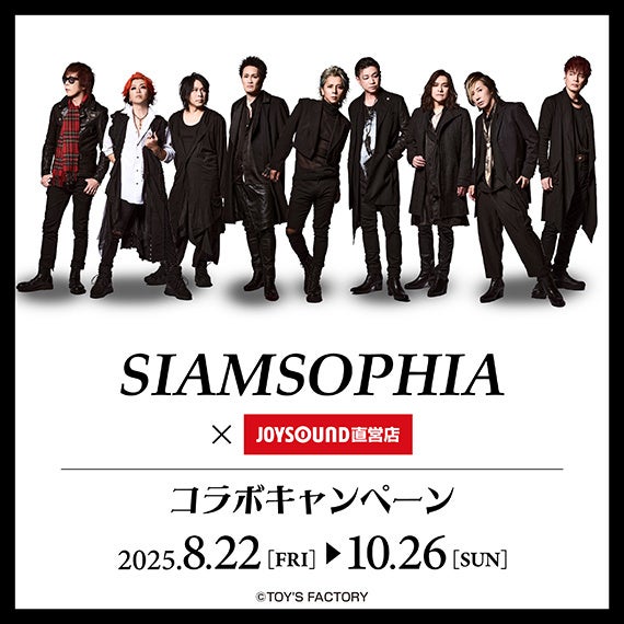 株式会社エクシングの子会社で、全国にカラオケ店舗・ネットカフェ店舗を展開する株式会社スタンダード(本社:東京都港区、代表取締役社長:小林克章)は、2025年8月22日(金)から2025年10月26日(日)までの期間中、「SIAMSOPHIA×JOYSOUND直営店コラボキャンペーン」と題し、今秋オープンするTOYOTA ARENA TOKYO(東京)で2025年10月13日(月・祝)に行われるライブ『2025 SIAMSOPHIA FINAL』の開催を記念して、JOYSOUND品川港南口店(東京)・JOYSOUNDなんば戎橋店(大阪)の2店舗にカラオケコラボルームをオープン!また、JOYSOUND直営店30店舗にて、オリジナルノベルティ付きコラボドリンクを展開します。