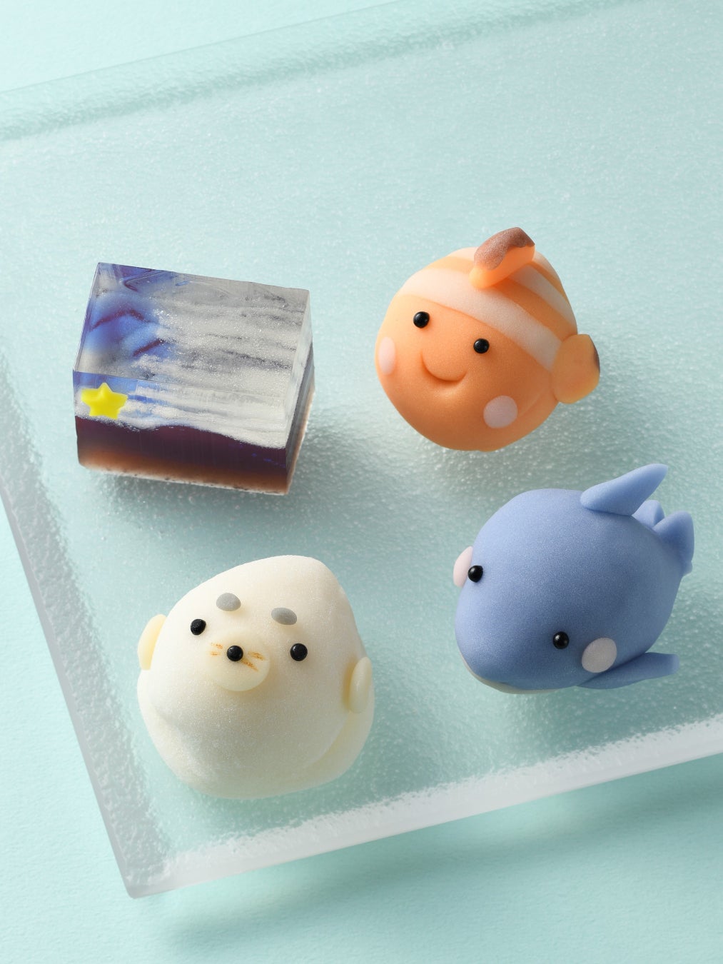 レモンピール入りの錦玉羹の中に海の世界を表現した「海中ようかん」。「あんもちあざらし」は、ホワイトチョコ&ミルク餡の求肥餅、「クマノミ」はココア餡入り練り切り製、「イルカ」はこし餡入り練り切り。
