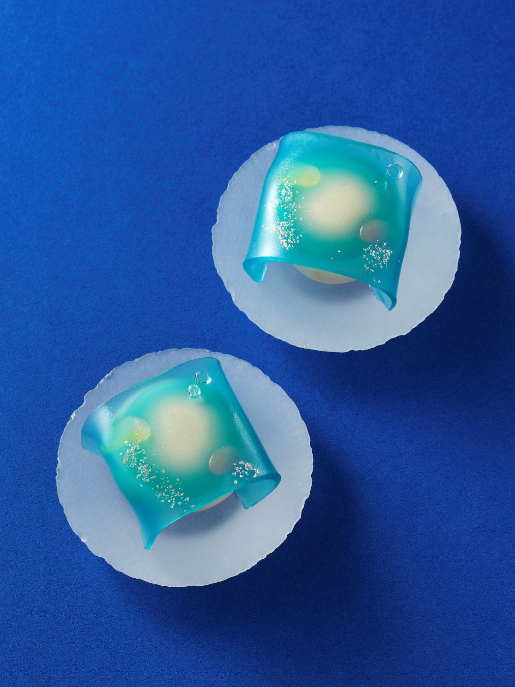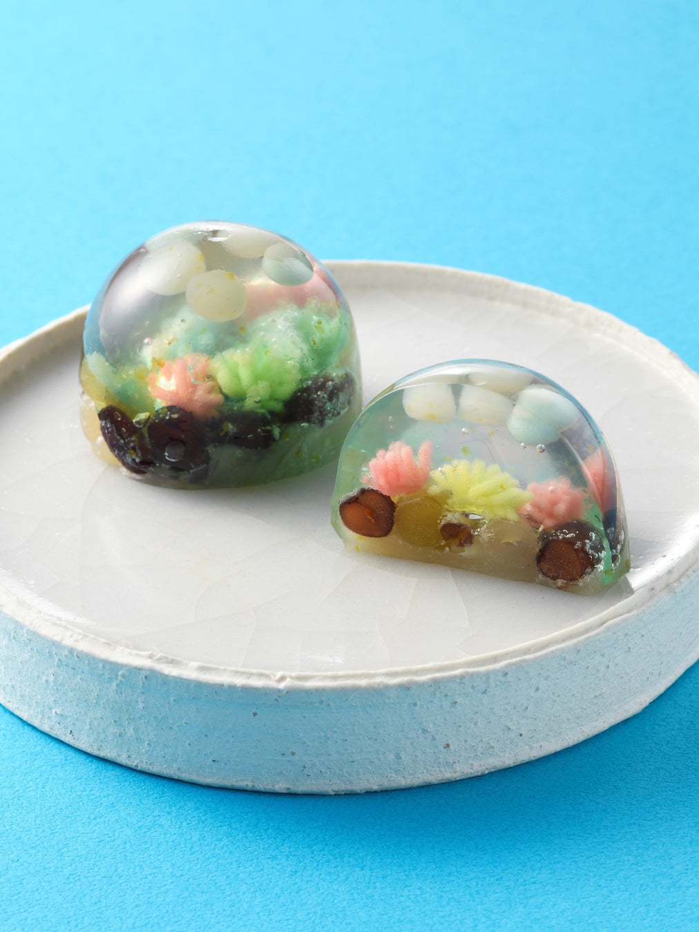 スノードームのようなクリアな錦玉羹の中に、色鮮やかなサンゴを練り切りで、揺らぐようなクラゲは葛と練り切りで表現。底には大納言小豆などを岩に見立てながら食感のアクセントに。優しい甘みに柚子の爽やかな風味が広がります。