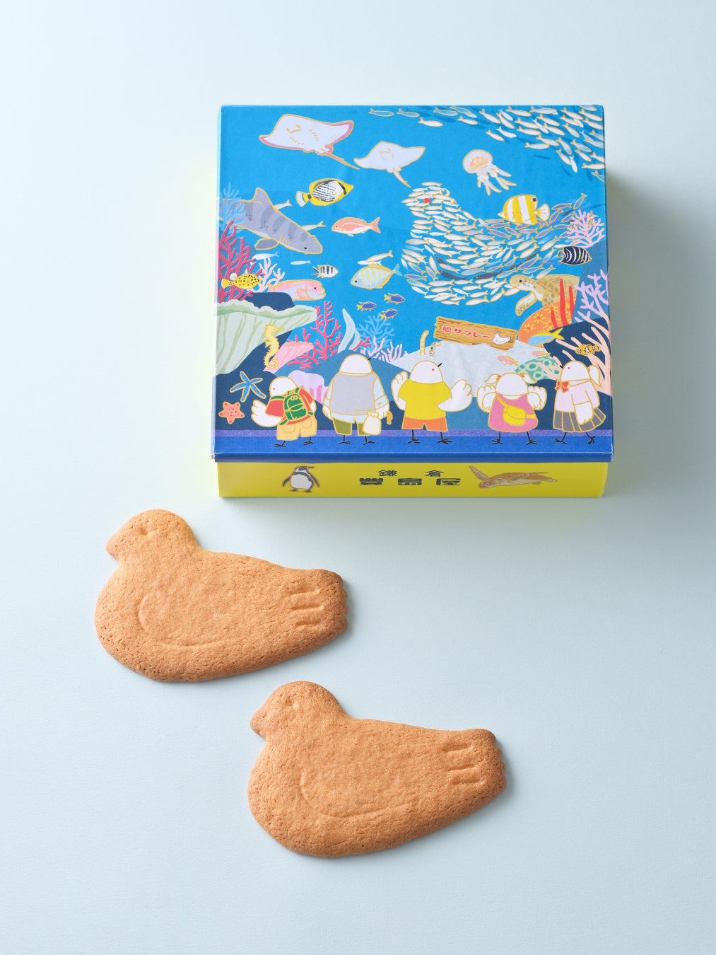 「お菓子の水族館」に合わせてデザインした限定缶。新江ノ島水族館をイメージした大水槽を眺めて楽しむ鳩たちのかわいさとマイワシの群泳のシルエットにも注目!
