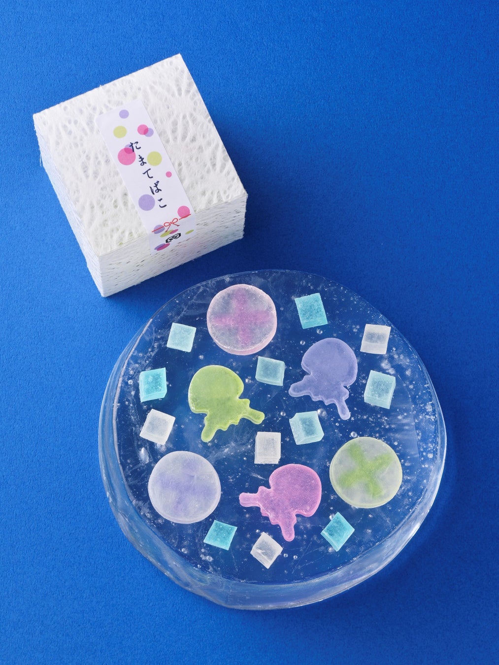 玉手箱を開けると色とりどりのクラゲたちがお出迎え。色ごとに異なる風味は5種。りんご風味、ぶどう風味、ミント風味、桃風味、ソーダ風味。